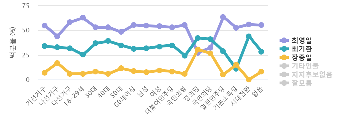 Áö¿ªº° ÀÀ´ä¿¡¼ "°¡¼±°Å±¸"Áö¿ªÀº¡¸ÃÖ¿µÀÏ¡¹(54.9%),¡¸ÃÖ±âȯ¡¹(33.9%),¡¸ÀåÁ¾ÀÏ¡¹(7.2%)À̸ç, "³ª¼±°Å±¸"Áö¿ªÀº¡¸ÃÖ¿µÀÏ¡¹(44.1%),¡¸ÃÖ±âȯ¡¹(32.6%),¡¸ÀåÁ¾ÀÏ¡¹(16.8%), "´Ù¼±°Å±¸"Áö¿ªÀº¡¸ÃÖ¿µÀÏ¡¹(58.2%),¡¸ÃÖ±âȯ¡¹(31.8%),¡¸ÀåÁ¾ÀÏ¡¹(5.9%)·Î ³ªÅ¸³µ´Ù.
