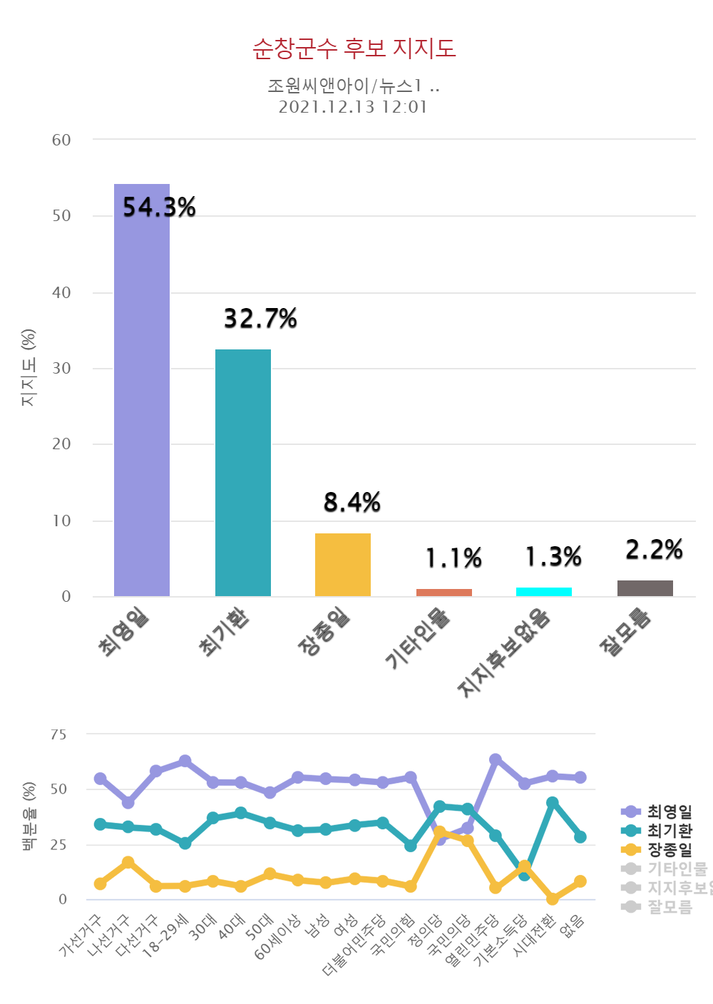 ¾ð·Ð»ç ´º½º1 ÀüºÏÃëÀ纻ºÎ ÀÇ·Ú·Î 12¿ù 10ÀÏ~11ÀÏ ÀÌÆ²°£ ½Ç½ÃÇÏ¿© 13ÀÏ ¹ßÇ¥ÇÑ ¼øÃ¢±º¼ö Èĺ¸ ÁöÁöµµ¸¦ ¹¯´Â Á¶»ç¿¡¼ ÃÖ¿µÀÏ Çö ÀüºÏµµÀÇȸ ºÎÀÇÀåÀÌ 54.3%¸¦ ±â·ÏÇÏ¿© 2À§ ÃÖ±âȯ Àü ¼øÁ¤ÃàÇù Á¶ÇÕÀå(32.7%)°ú 21.6%Æ÷ÀÎÆ® Â÷ÀÌ·Î ¼±µÎ¸¦ ÁöŰ´Â °ÍÀ¸·Î ³ªÅ¸³µ´Ù. µÚ¸¦ À̾î ÀåÁ¾ÀÏ Çö ¹ÎÁÖ´çÀüºÏµµ´ç ºÎÀ§¿øÀåÀÌ 8.4%·Î 3À§¸¦ ÇÏ´Â °ÍÀ¸·Î ³ªÅ¸³µ´Ù.