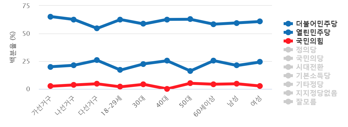 Áö¿ªº° ÀÀ´ä¿¡¼ "°¡¼±°Å±¸"Áö¿ªÀº¡¸´õºÒ¾î¹ÎÁִ硹(65.3%),¡¸¿¸°¹ÎÁִ硹(20%),¡¸ÁöÁöÁ¤´ç¾øÀ½¡¹(2.5%)À̸ç, "³ª¼±°Å±¸"Áö¿ªÀº¡¸´õºÒ¾î¹ÎÁִ硹(62.7%),¡¸¿¸°¹ÎÁִ硹(21.3%),¡¸Á¤ÀǴ硹(5%), "´Ù¼±°Å±¸"Áö¿ªÀº¡¸´õºÒ¾î¹ÎÁִ硹(54.6%),¡¸¿¸°¹ÎÁִ硹(25.8%),¡¸ÁöÁöÁ¤´ç¾øÀ½¡¹(6.5%)·Î ³ªÅ¸³µ´Ù.