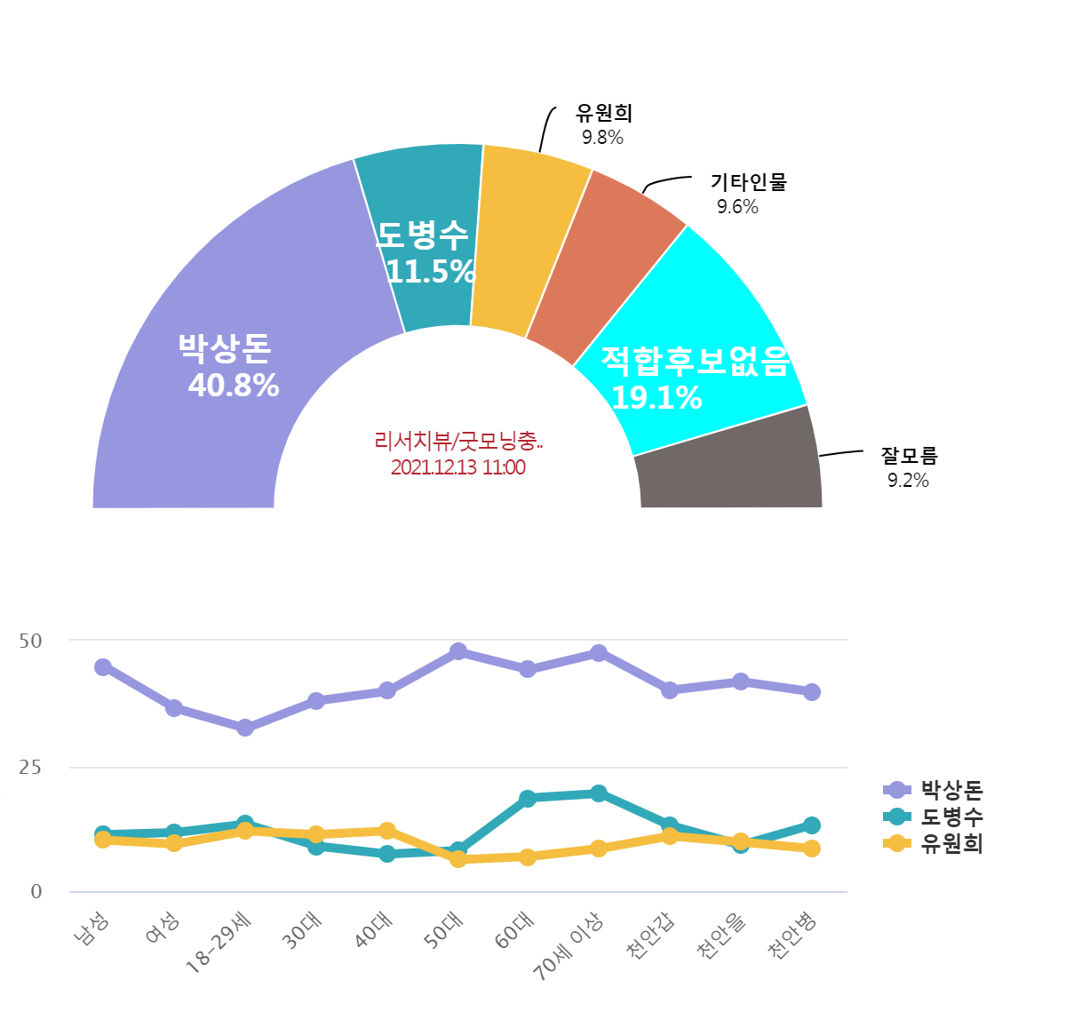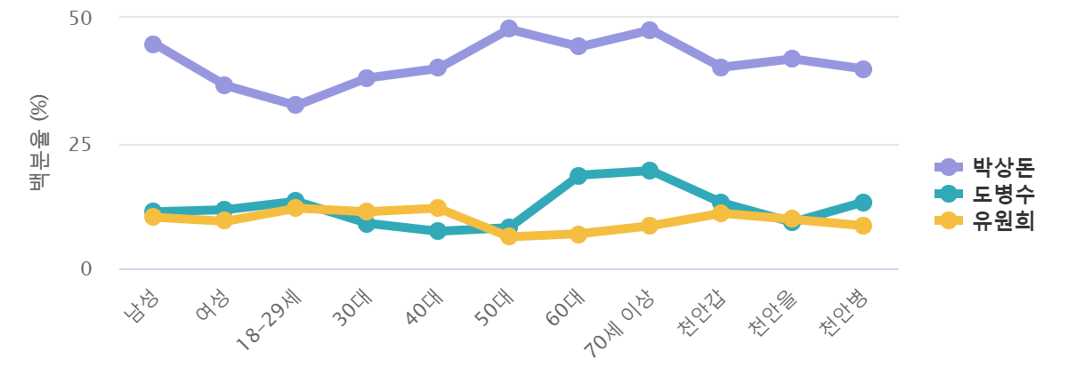 ¹Ú»óµ· õ¾È½ÃÀåÀº 50´ë(47.7%), 70¼¼ ÀÌ»ó(47.6%), ³²¼º(44.8%), 60´ë(44.2%), õ¾ÈÀ»(41.8%)¼øÀ¸·Î ³ôÀº ÁöÁö¸¦ ¹ÞÀ¸¸ç, µµº´¼ö Àü ¼¿ïÁß¾ÓÁö°Ë °Ë»ç´Â 70¼¼ ÀÌ»ó(19.5%), 60´ë(18.6%), 18-29¼¼(13.4%), õ¾Èº´(13.2%), õ¾È°©(13.1%)¼øÀ¸·Î, À¯¿øÈñ õ¾È¹Ì·¡¹ßÀü¿¬±¸¿ø ¿øÀåÀº 40´ë(12.0%), 18-29¼¼(12.0%), 30´ë(11.3%), õ¾È°©(11.0%), ³²¼º(10.2%)¼øÀ¸·Î ÁöÁö¸¦ ¹Þ´Â °ÍÀ¸·Î ³ªÅ¸³µ´Ù.