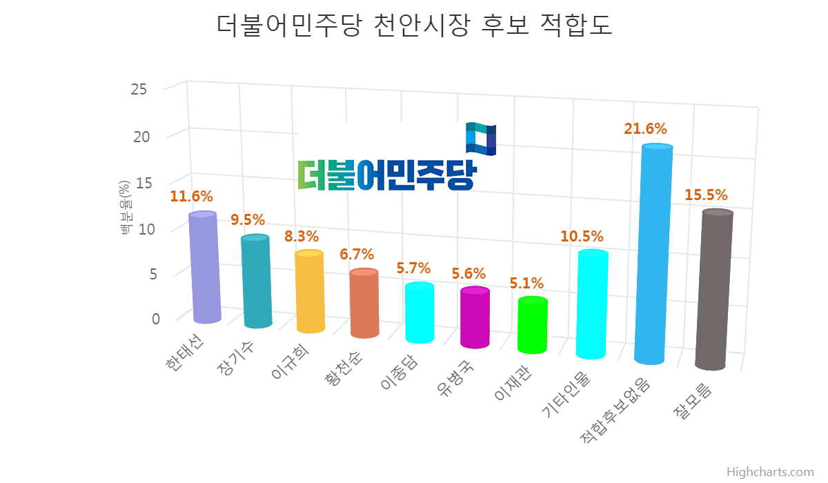 ´õºÒ¾î¹ÎÁÖ´ç õ¾È½ÃÀå Èĺ¸ ÀûÇÕµµ¿¡¼ ÇÑż± Àü û¿Í´ë ÇàÁ¤°ü´Â 11.6%·Î 1À§¸¦, Àå±â¼ö ±¹¹Î¼ÒÅë Æ¯º°À§¿ø´Â 9.5%·Î 2À§¸¦, À̱ÔÈñ Àü ±¹È¸ÀÇ¿øÀº 8.3%·Î 3À§¸¦, Ȳõ¼ø õ¾È½ÃÀÇȸ ÀÇÀåÀº 6.7%·Î 4À§¸¦, ÀÌÁ¾´ã Àü õ¾È½ÃÀÇ¿øÀº 5.7%·Î 5À§¸¦, À¯º´±¹ Àü Ãæ³²µµÀÇȸ ÀÇÀåÀº 5.6%·Î 6À§¸¦, ÀÌÀç°ü Àü ´ëÀü½Ã ÇàÁ¤ºÎ½ÃÀåÀº 5.1%·Î 7À§¸¦ ÇÏ´Â °ÍÀ¸·Î °á°ú¸¦ º¸¿´´Ù.