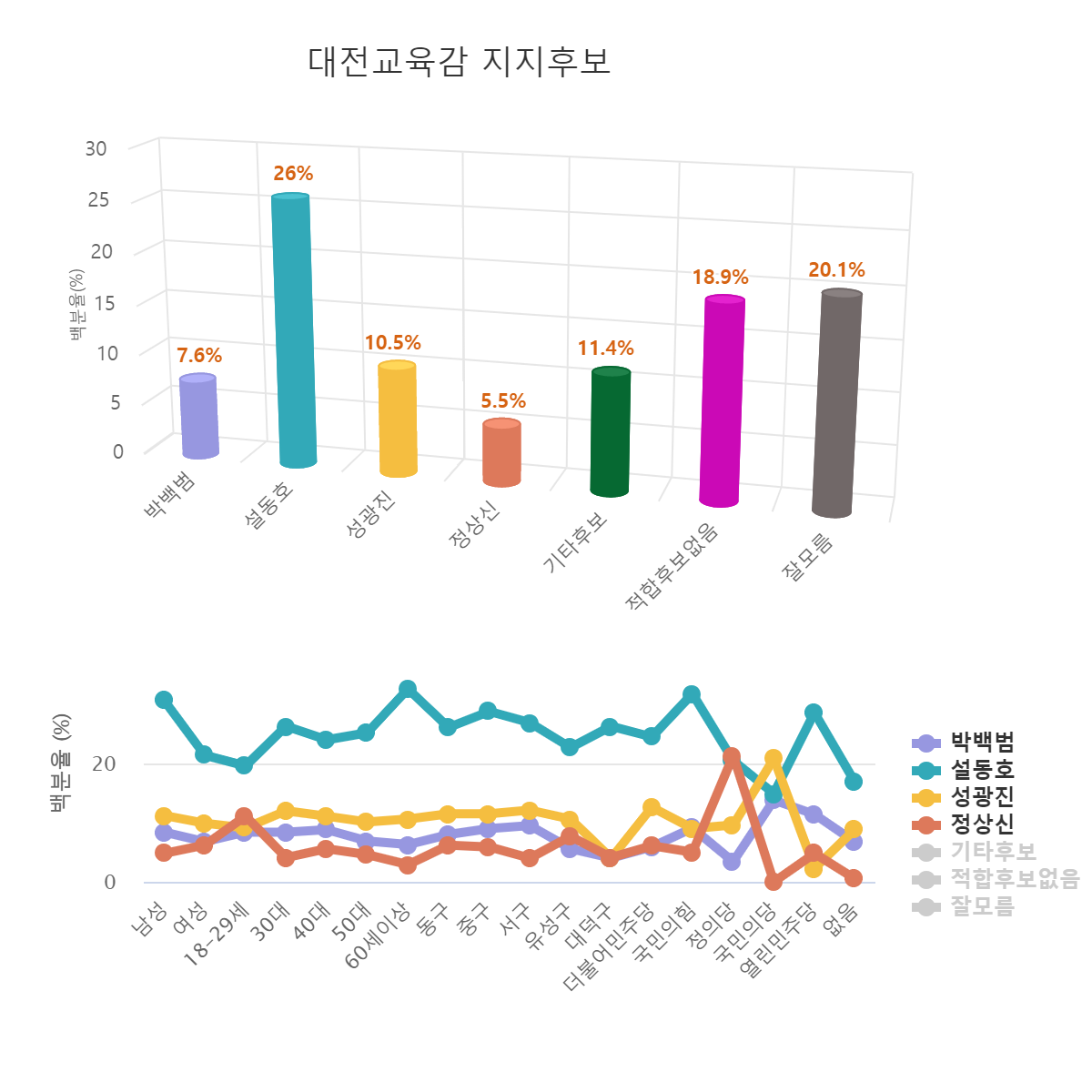 ´ëÀü½Ã ±³À°°¨ ÁöÁöµµ..¼³µ¿È£26%, 2À§ ¼º±¤Áø(10.5%)¿¡ 15.5% Â÷ÀÌ·Î ¾Õ¼