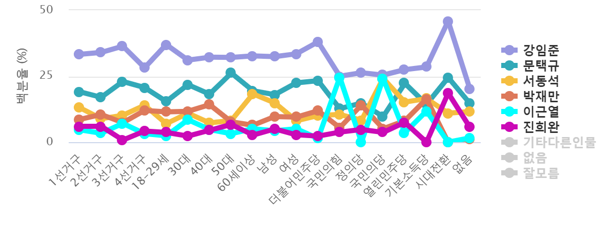 Áö¿ªº° ÀÀ´ä¿¡¼­ "1¼±°Å±¸"Áö¿ªÀº¡¸°­ÀÓÁØ¡¹(33.3%),¡¸¹®Åñԡ¹(19.1%),¡¸¼­µ¿¼®¡¹(13.1%)À̸ç, "2¼±°Å±¸"Áö¿ªÀº¡¸°­ÀÓÁØ¡¹(34%),¡¸¹®Åñԡ¹(17%),¡¸À߸𸧡¹(10.5%), "3¼±°Å±¸"Áö¿ªÀº¡¸°­ÀÓÁØ¡¹(36.4%),¡¸¹®Åñԡ¹(23%),¡¸¼­µ¿¼®¡¹(10.2%), "4¼±°Å±¸"Áö¿ªÀº¡¸°­ÀÓÁØ¡¹(28.2%),¡¸¹®Åñԡ¹(20.7%),¡¸¼­µ¿¼®¡¹(14%)¸¦ ±â·ÏÇß´Ù.