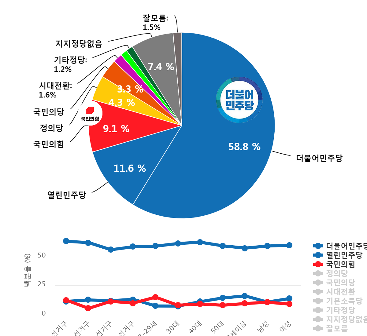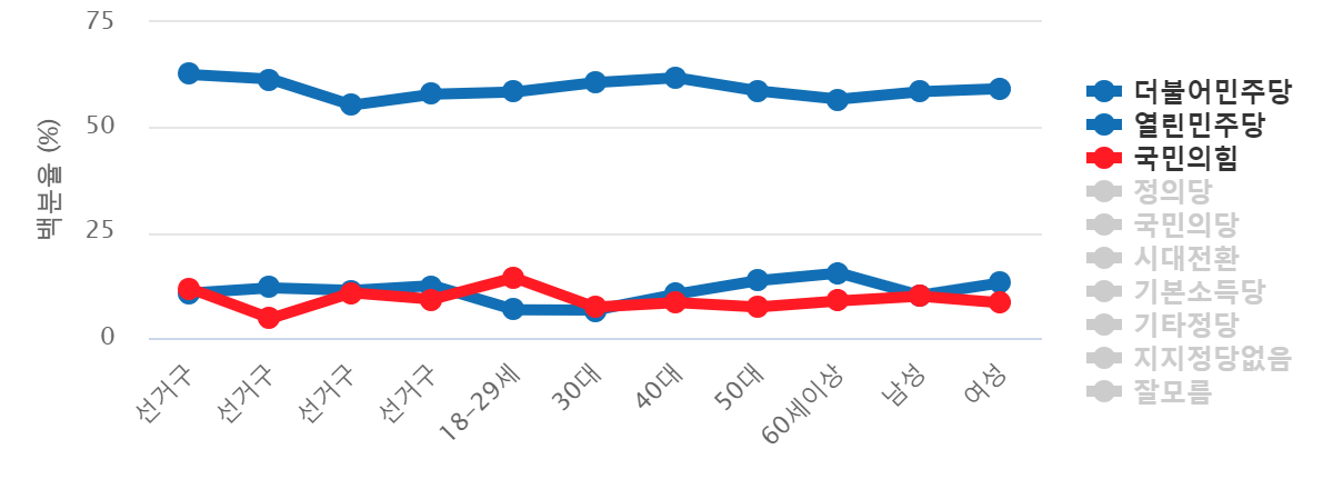 Á¤´çÁöÁöµµ ¼ºº° ÀÀ´ä¿¡¼­ "³²¼º"Àº¡¸´õºÒ¾î¹ÎÁִ硹(58.5%),¡¸¿­¸°¹ÎÁִ硹(10.1%),¡¸±¹¹ÎÀÇÈû¡¹(9.9%)À̸ç, "¿©¼º"Àº¡¸´õºÒ¾î¹ÎÁִ硹(59.2%),¡¸¿­¸°¹ÎÁִ硹(13.1%),¡¸ÁöÁöÁ¤´ç¾øÀ½¡¹(8.3%)·Î °á°ú¸¦ º¸¿´´Ù.