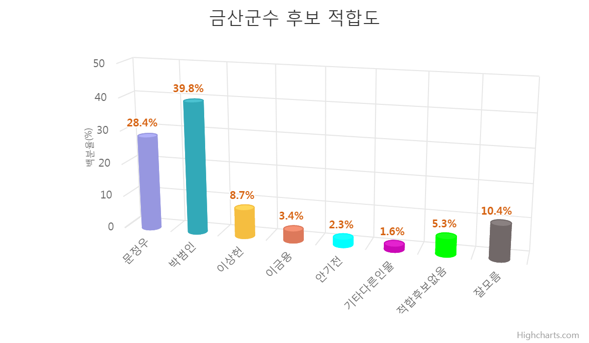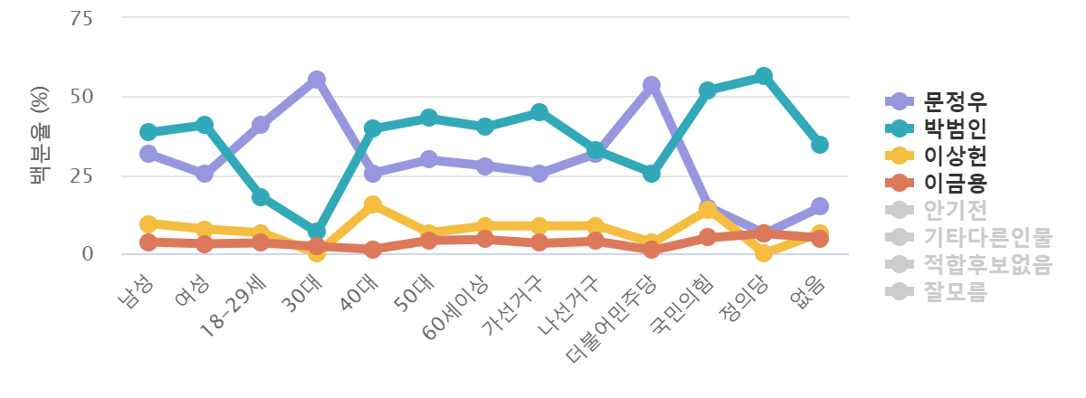 ³²¼ºÀº ¹Ú¹üÀÎ Àü Ãæ³²µµ ³ó¸²±¹ÀåÀÌ 38.5%¸¦ ¾ò¾î 1À§¸¦, ¿©¼ºÀº ¹Ú¹üÀÎ Àü Ãæ³²µµ ³ó¸²±¹ÀåÀÌ 40.9%¸¦ ¾ò¾î 1À§¸¦, 18-29¼¼´Â ¹®Á¤¿ì ±Ý»ê±º¼ö°¡ 41%¸¦ ¾ò¾î 1À§¸¦, 30´ë´Â ¹®Á¤¿ì ±Ý»ê±º¼ö°¡ 55.6%¸¦ ¾ò¾î 1À§¸¦, 40´ë´Â ¹Ú¹üÀÎ Àü Ãæ³²µµ ³ó¸²±¹ÀåÀÌ 39.7%¸¦ ¾ò¾î 1À§¸¦, 50´ë´Â ¹Ú¹üÀÎ Àü Ãæ³²µµ ³ó¸²±¹ÀåÀÌ 43%¸¦ ¾ò¾î 1À§¸¦, 60¼¼ÀÌ»óÀº ¹Ú¹üÀÎ Àü Ãæ³²µµ ³ó¸²±¹ÀåÀÌ 40.3%¸¦ ¾ò¾î 1À§¸¦, °¡¼±°Å±¸Áö¿ªÀº ¹Ú¹üÀÎ Àü Ãæ³²µµ ³ó¸²±¹ÀåÀÌ 44.8%¸¦ ¾ò¾î 1À§¸¦, ³ª¼±°Å±¸Áö¿ªÀº ¹Ú¹üÀÎ Àü Ãæ³²µµ ³ó¸²±¹ÀåÀÌ 32.7%¸¦ ¾ò¾î 1À§¸¦, ´õºÒ¾î¹ÎÁÖ´çÁöÁöÃþÀº ¹®Á¤¿ì ±Ý»ê±º¼ö°¡ 53.6%¸¦ ¾ò¾î 1À§¸¦, ±¹¹ÎÀÇÈûÁöÁöÃþÀº ¹Ú¹üÀÎ Àü Ãæ³²µµ ³ó¸²±¹ÀåÀÌ 52%¸¦ ¾ò¾î 1À§¸¦, Á¤ÀÇ´çÁöÁöÃþÀº ¹Ú¹üÀÎ Àü Ãæ³²µµ ³ó¸²±¹ÀåÀÌ 56.3%¸¦ ¾ò¾î 1À§¸¦ °¢°¢ ±â·ÏÇß´Ù.
