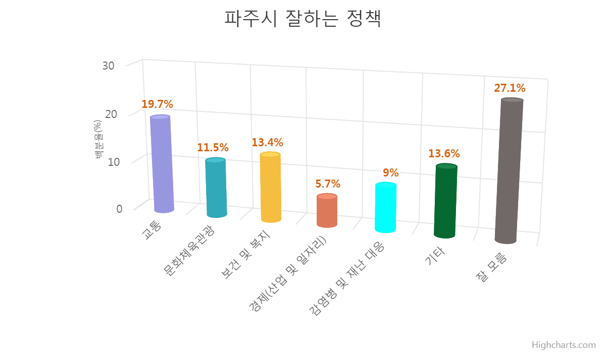 ¡¸ÆÄÁֽà ÀßÇÏ´Â Á¤Ã¥¡¹Á¶»ç¿¡¼ ±³Åë 19.7%, º¸°Ç ¹× º¹Áö 13.4%, ¹®ÈüÀ°°ü±¤ 11.5%ÀÌ ´Ù¼Ò ³ô°Ô ³ª¿Ô°í, °¨¿°º´ ¹× Àç³ ´ëÀÀ 9%, °æÁ¦(»ê¾÷ ¹× ÀÏÀÚ¸®) 5.7%´Â ³·°Ô ³ª¿Ô´Ù.