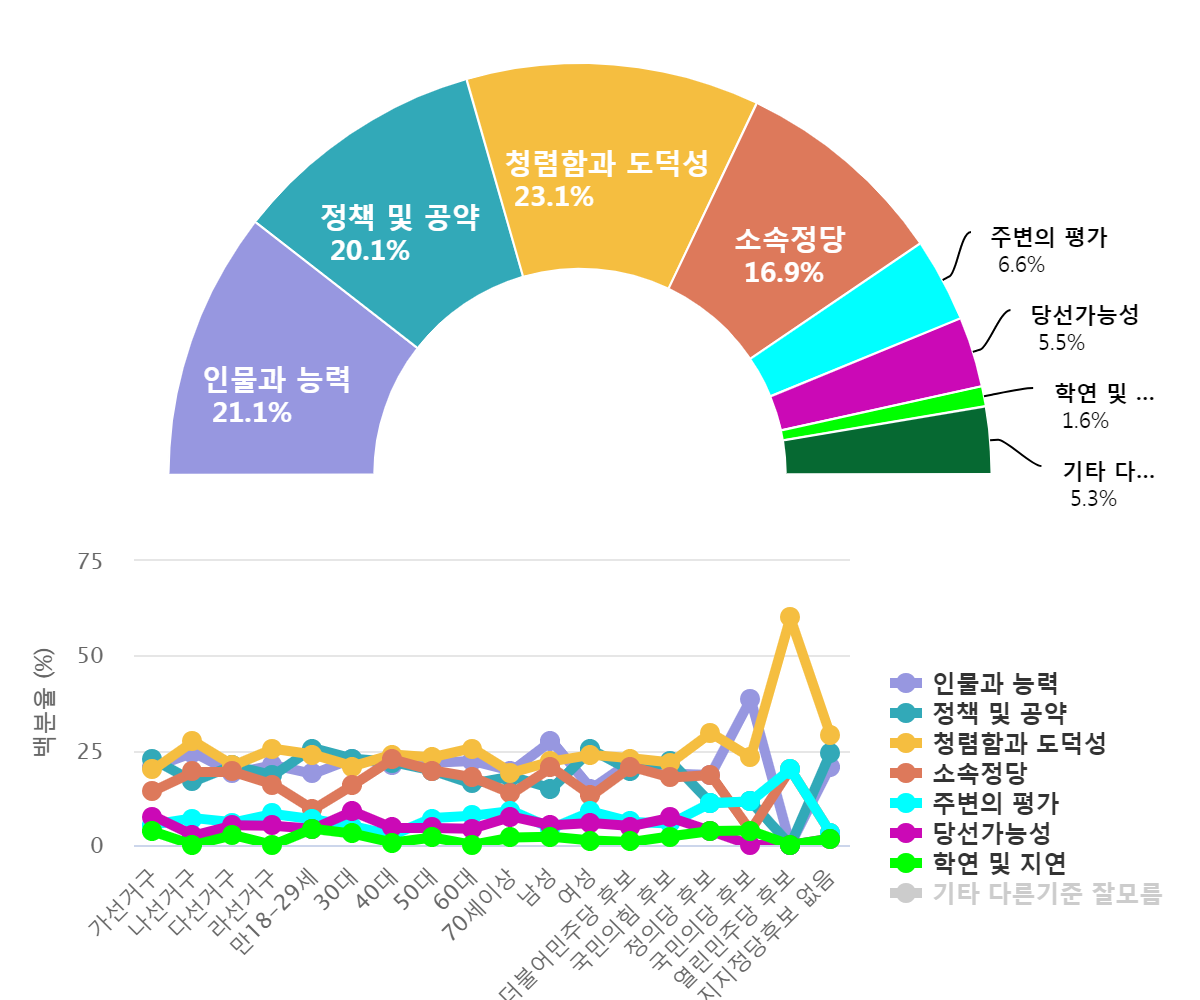 ¡ã ¾çÆò±º¼ö Èĺ¸ ¼±ÅñâÁØ¡¥Ã»·ÅÇÔ°ú µµ´ö¼º 23.1%, Àι°°ú ´É·Â 21.1%, Á¤Ã¥ ¹× °ø¾à 20.1%, ¼Ò¼ÓÁ¤´ç 16.9%, ÁÖº¯ÀÇ Æò°¡ 6.6%, ´ç¼±°¡´É¼º 5.5%, Çп¬ ¹× Áö¿¬ 1.6% ¼øÀ¸·Î ³ªÅ¸³ª