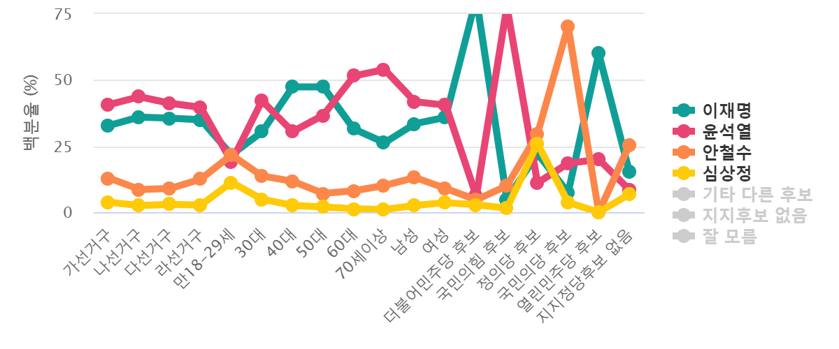 ¿¬·É´ëº° ÁöÁöµµ ºÐ¼®¿¡¼­ "ÀÌÀç¸í" È帴 50´ë(47.4%), 40´ë(47.4%), 60´ë(31.5%), ¿¬·É´ë ¼øÀ¸·Î, "À±¼®¿­" È帴 70¼¼ÀÌ»ó(54%), 60´ë(51.5%), 30´ë(42.2%), ¿¬·É´ë ¼øÀ¸·Î, "¾Èö¼ö" È帴 ¸¸18-29¼¼(21.7%), 30´ë(13.7%), 40´ë(11.7%), ¿¬·É´ë ¼øÀ¸·Î, "½É»óÁ¤" È帴 ¸¸18-29¼¼(11.3%), 30´ë(4.9%), 40´ë(2.6%), ¿¬·É´ë ¼øÀ¸·Î, "±âŸ ´Ù¸¥ Èĺ¸" È帴 ¸¸18-29¼¼(9.6%), 40´ë(3.9%), 60´ë(3%), ¿¬·É´ë ¼øÀ¸·Î °­¼¼¸¦ º¸ÀÌ´Â °ÍÀ¸·Î ³ªÅ¸³µ´Ù.
