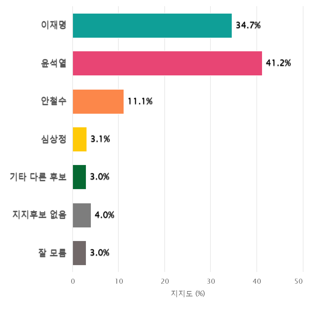 ¡ã ¾çÆò±º ´ëÅë·ÉÈĺ¸ ÁöÁöµµ¡¥À±¼®¿­ 41.2%, ÀÌÀç¸í 34.7%, ¾Èö¼ö 11.1%, ½É»óÁ¤ 3.1% ¼øÀ¸·Î ³ªÅ¸³ª