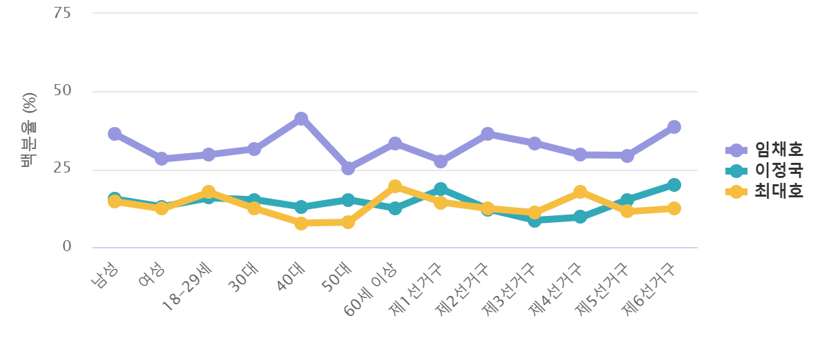 "Á¦1¼±°Å±¸"Áö¿ªÀº¡¸ÃÖ´ëÈ£¡¹(27.7%),¡¸±è´ë¿µ¡¹(18.6%),¡¸Àå°æ¼ø¡¹(14.4%)À̸ç, "Á¦2¼±°Å±¸"Áö¿ªÀº¡¸ÃÖ´ëÈ£¡¹(36.3%),¡¸Àå°æ¼ø¡¹(12.4%),¡¸±è´ë¿µ¡¹(12.2%), "Á¦3¼±°Å±¸"Áö¿ªÀº¡¸ÃÖ´ëÈ£¡¹(33.4%),¡¸Àå°æ¼ø¡¹(11.1%),¡¸±è´ë¿µ¡¹(8.6%), "Á¦4¼±°Å±¸"Áö¿ªÀº¡¸ÃÖ´ëÈ£¡¹(29.6%),¡¸Àå°æ¼ø¡¹(17.6%),¡¸±è´ë¿µ¡¹(9.6%), "Á¦5¼±°Å±¸"Áö¿ªÀº¡¸ÃÖ´ëÈ£¡¹(29.5%),¡¸±è´ë¿µ¡¹(15.3%),¡¸Àå°æ¼ø¡¹(11.4%), "Á¦6¼±°Å±¸"Áö¿ªÀº¡¸ÃÖ´ëÈ£¡¹(38.6%),¡¸±è´ë¿µ¡¹(20.1%),¡¸Àå°æ¼ø¡¹(12.4%)·Î °á°ú¸¦ º¸¿´´Ù.