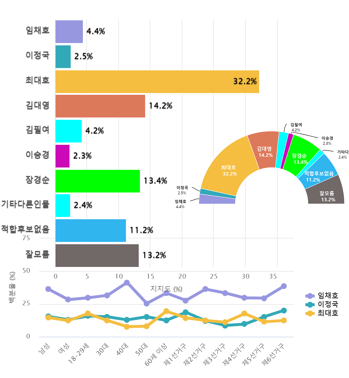 ¼ºº° ÁöÁöµµ ºÐ¼®¿¡¼­ "ÃÖ´ëÈ£" È帴 ³²¼º(36.2%), ¿©¼º(28.3%)¼øÀ¸·Î, "±è´ë¿µ" È帴 ³²¼º(15.4%), ¿©¼º(13%)¼øÀ¸·Î, "Àå°æ¼ø" È帴 ³²¼º(14.6%), ¿©¼º(12.3%)¼øÀ¸·Î °­¼¼¸¦ º¸ÀÌ´Â °ÍÀ¸·Î ³ªÅ¸³µ´Ù.