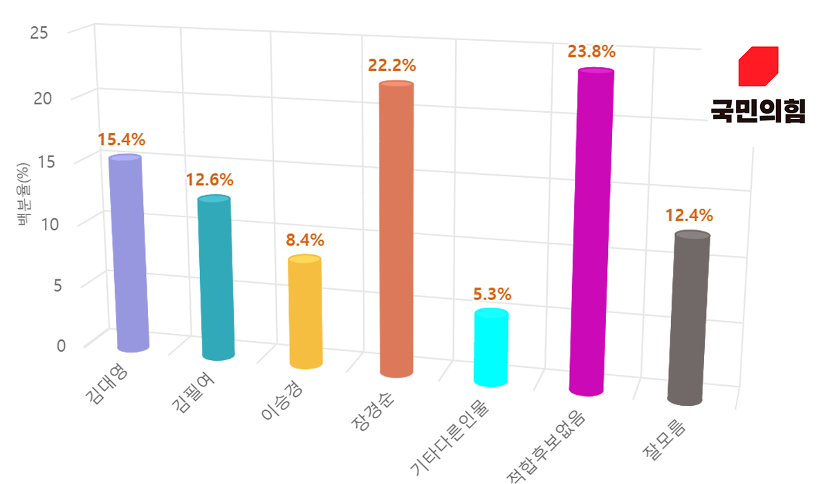 ¡¸±¹¹ÎÀÇÈû ¾È¾ç½ÃÀå Èĺ¸ ÀûÇÕµµ¡¹Á¶»ç¿¡¼­´Â Àå°æ¼ø ±¹¹ÎÀÇÈû °æ±âµµ´ç ÀÎÀ翵ÀÔÀ§¿øÀåÀÌ 22.2%¸¦ ±â·ÏÇÏ¿© 2À§ ±è´ë¿µ ±¹¹ÎÀÇÈû °æ±âµµ´ç ºÎÀ§¿øÀå(15.4%)¿Í 6.8%Æ÷ÀÎÆ® Â÷ÀÌ·Î ¼±µÎ¸¦ ÁöŰ´Â °ÍÀ¸·Î ³ªÅ¸³µ´Ù. µÚ¸¦ ÀÌ¾î ±èÇÊ¿© ¾È¾ç½ÃÀÇ¿øÀÌ 12.6%·Î 3À§, ÀÌ½Â°æ ´õ²ÞÀÇÇб³ ±³ÀåÀÌ 8.4%·Î 4À§¸¦ ÇÏ´Â °ÍÀ¸·Î °á°ú¸¦ º¸¿´´Ù. ¡¸ÀûÇÕÈĺ¸¾øÀ½¡¹23.8%,¡¸À߸𸧡¹12.4%,¡¸±âŸ´Ù¸¥Àι°¡¹5.3%ÀÇ ÀÀ´äµµ ±â·ÏµÇ¾ú´Ù.