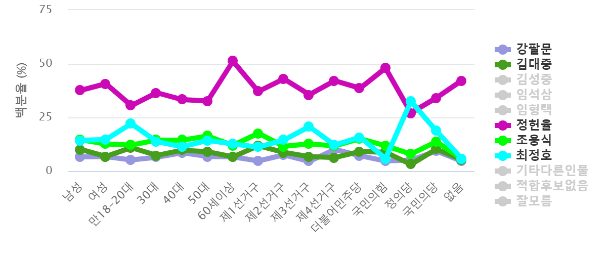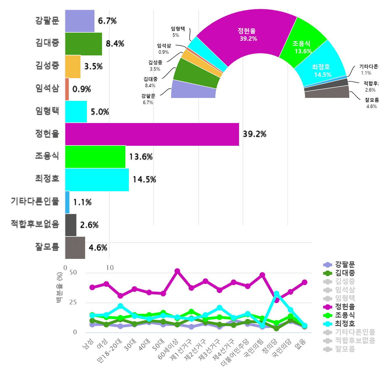 ¼ºº° ÁöÁöµµ ºÐ¼®¿¡¼ "°ÆÈ¹®" È帴 ¿©¼º(6.7%), ³²¼º(6.6%)¼øÀ¸·Î, "±è´ëÁß" È帴 ³²¼º(10.1%), ¿©¼º(6.8%)¼øÀ¸·Î, "±è¼ºÁß" È帴 ³²¼º(4.5%), ¿©¼º(2.4%)¼øÀ¸·Î, "ÀÓ¼®»ï" È帴 ³²¼º(0.9%), ¿©¼º(0.8%)¼øÀ¸·Î, "ÀÓÇüÅÃ" È帴 ¿©¼º(6.4%), ³²¼º(3.5%)¼øÀ¸·Î, "Á¤ÇåÀ²" È帴 ¿©¼º(40.7%), ³²¼º(37.6%)¼øÀ¸·Î, "Á¶¿ë½Ä" È帴 ³²¼º(14.6%), ¿©¼º(12.6%)¼øÀ¸·Î, "ÃÖÁ¤È£" È帴 ¿©¼º(14.7%), ³²¼º(14.3%)¼øÀ¸·Î, "±âŸ´Ù¸¥Àι°" È帴 ¿©¼º(1.2%), ³²¼º(1%)¼øÀ¸·Î °¼¼¸¦ º¸ÀÌ´Â °ÍÀ¸·Î ³ªÅ¸³µ´Ù.