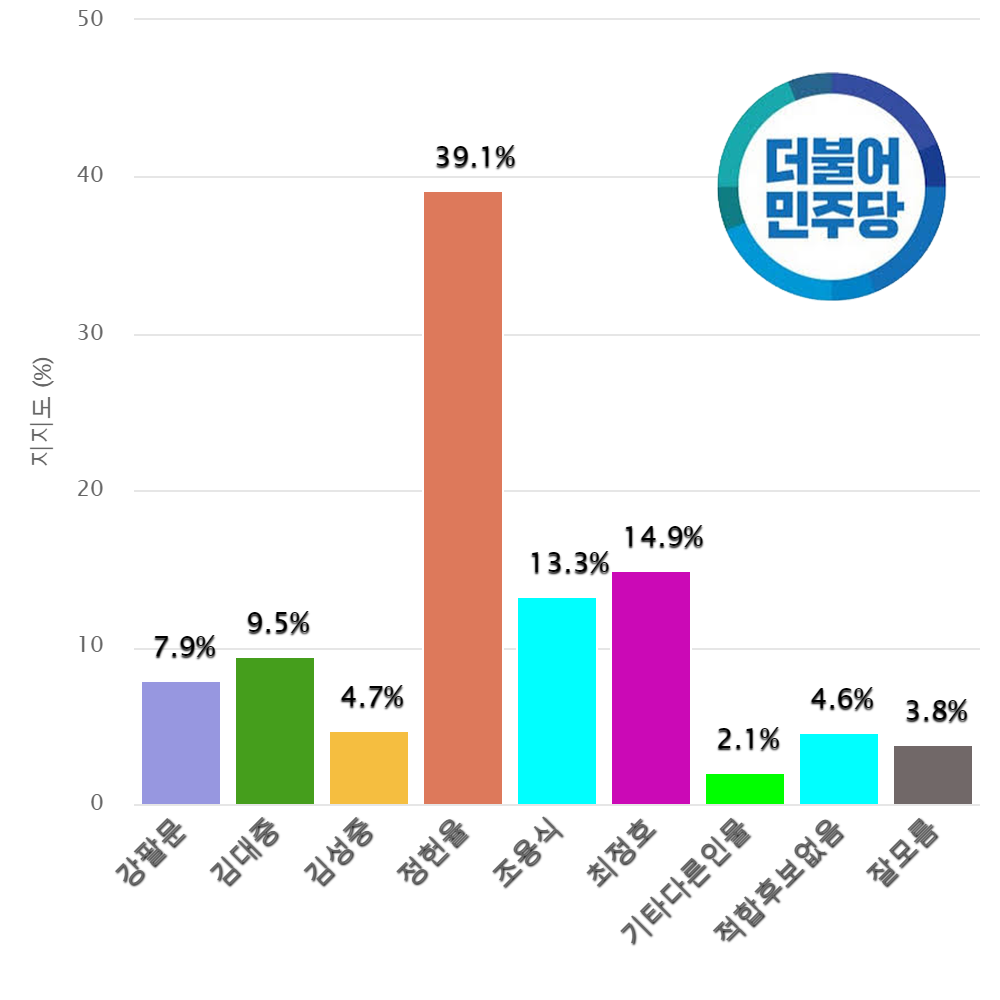¡ã ´õºÒ¾î¹ÎÁÖ´ç Â÷±â ÀÍ»ê½ÃÀå Èĺ¸ ÀûÇÕµµ¡¥Á¤ÇåÀ² 39.1%, ÃÖÁ¤È£ 14.9%, Á¶¿ë½Ä 13.3%, ±è´ëÁß 9.5%, °ÆÈ¹® 7.9%, ±è¼ºÁß 4.7%