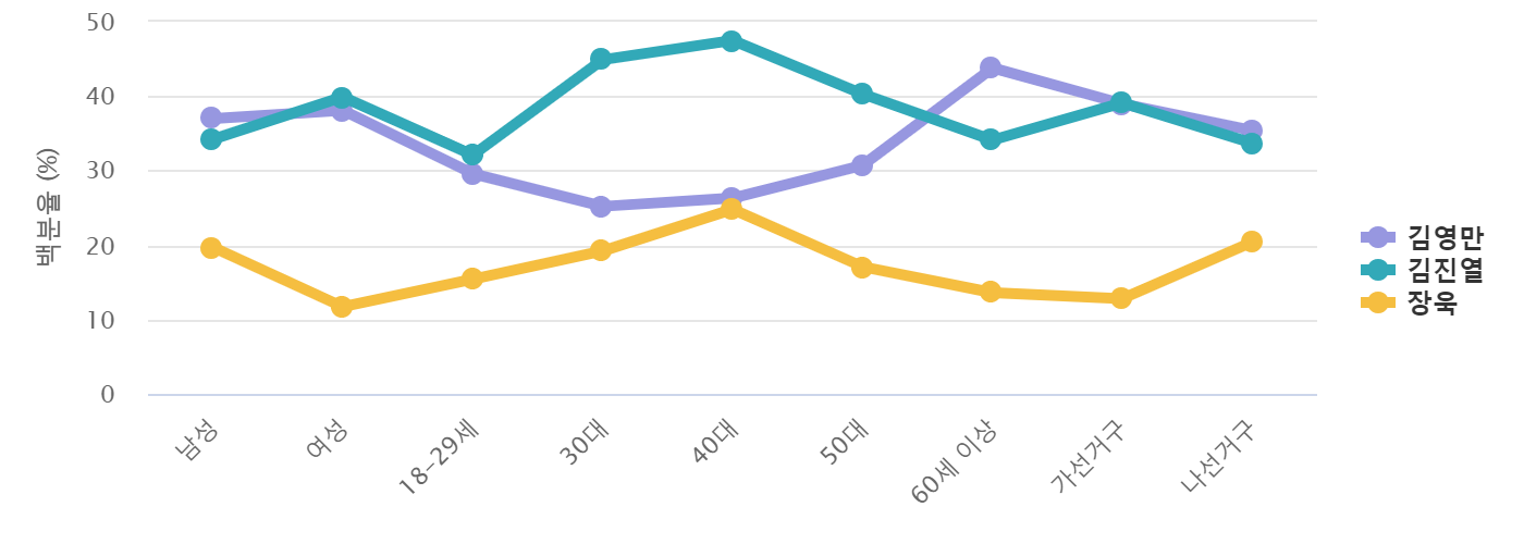 Áö¿ªº° ÁöÁöµµ ºÐ¼®¿¡¼ "±è¿µ¸¸" È帴 °¡¼±°Å±¸(39%), ³ª¼±°Å±¸(35.4%)Áö¿ª ¼øÀ¸·Î, "±èÁø¿" È帴 °¡¼±°Å±¸(39.1%), ³ª¼±°Å±¸(33.7%)Áö¿ª ¼øÀ¸·Î, "Àå¿í" È帴 ³ª¼±°Å±¸(20.4%)°¡¼±°Å±¸(12.8%)Áö¿ª ¼øÀ¸·Î °¼¼¸¦ º¸ÀÌ´Â °ÍÀ¸·Î ³ªÅ¸³µ´Ù.