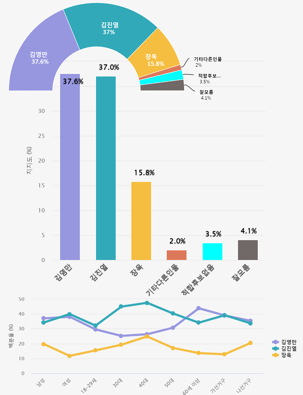 "°¡¼±°Å±¸"Áö¿ªÀº¡¸±èÁø¿¡¹(39.1%),¡¸±è¿µ¸¸¡¹(39%),¡¸Àå¿í¡¹(12.8%)À̸ç, "³ª¼±°Å±¸"Áö¿ªÀº¡¸±è¿µ¸¸¡¹(35.4%),¡¸±èÁø¿¡¹(33.7%),¡¸Àå¿í¡¹(20.4%)¸¦ ±â·ÏÇß´Ù.