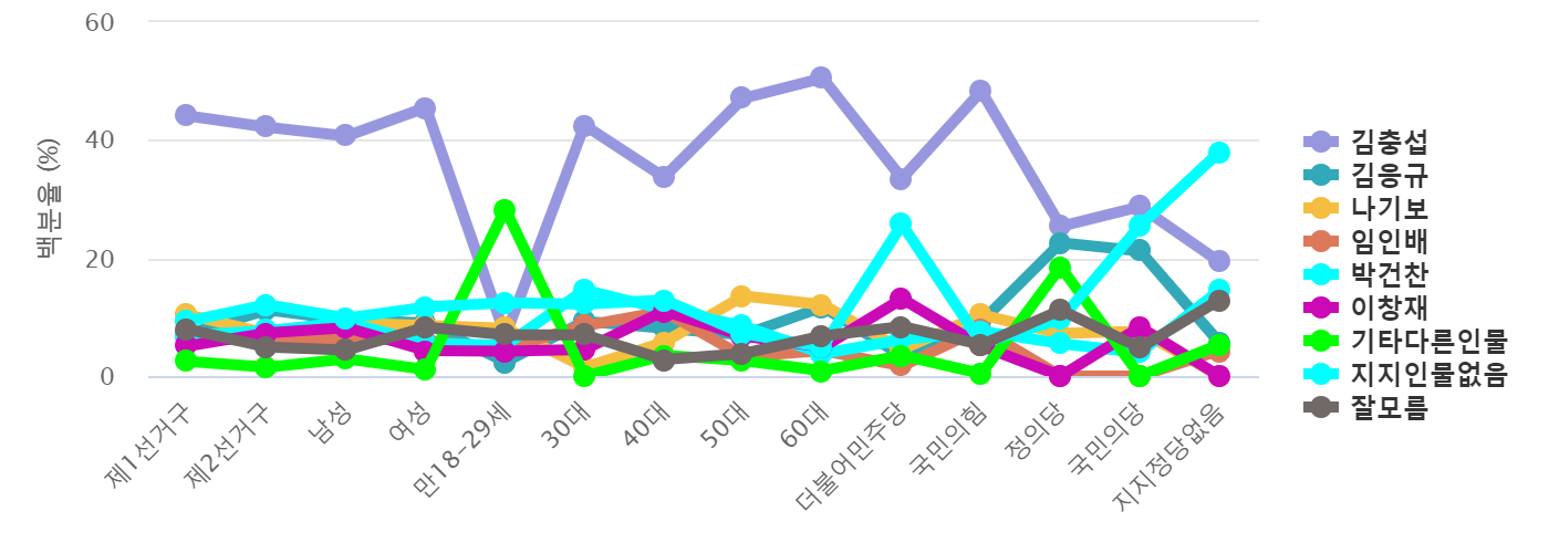 "Á¦1¼±°Å±¸"Áö¿ªÀº¡¸±èÃæ¼·¡¹(44.1%),¡¸³ª±âº¸¡¹(10.4%),¡¸±èÀÀ±Ô¡¹(7.1%)À̸ç, "Á¦2¼±°Å±¸"Áö¿ªÀº¡¸±èÃæ¼·¡¹(42.2%),¡¸±èÀÀ±Ô¡¹(11.2%),¡¸¹Ú°ÇÂù¡¹(7.7%)·Î ³ªÅ¸³µ´Ù.