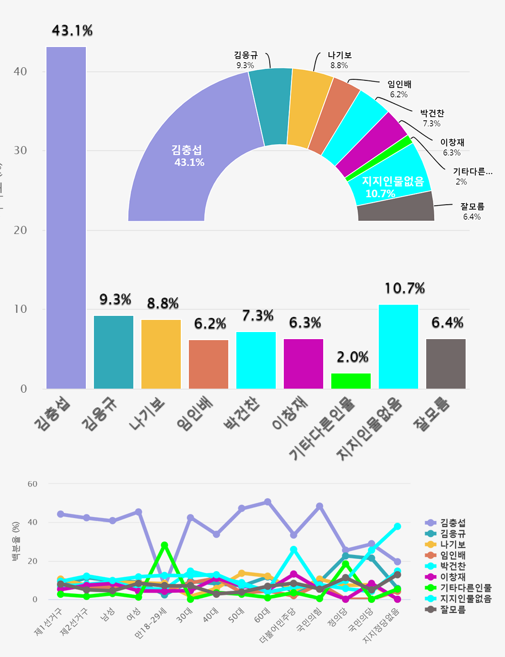 ¿¬·É´ëº° ÁöÁöµµ ºÐ¼®¿¡¼ "±èÃæ¼·" È帴 60´ë(50.5%), 50´ë(47.1%), 30´ë(42.5%), ¿¬·É´ë ¼øÀ¸·Î, "±èÀÀ±Ô" È帴 60´ë(11.7%), 30´ë(9.3%), 40´ë(8.1%), ¿¬·É´ë ¼øÀ¸·Î, "³ª±âº¸" È帴 50´ë(13.6%), 60´ë(12.1%), ¸¸18-29¼¼(8.1%), ¿¬·É´ë ¼øÀ¸·Î, "ÀÓÀιè" È帴 40´ë(11%), 30´ë(8.5%), ¸¸18-29¼¼(4.7%), ¿¬·É´ë ¼øÀ¸·Î, "¹Ú°ÇÂù" È帴 30´ë(14.6%), 40´ë(11.3%), 50´ë(8.5%), ¿¬·É´ë ¼øÀ¸·Î, "ÀÌâÀç" È帴 40´ë(11%), 50´ë(6.8%), 60´ë(4.9%), ¿¬·É´ë ¼øÀ¸·Î °¼¼¸¦ º¸ÀÌ´Â °ÍÀ¸·Î ³ªÅ¸³µ´Ù.