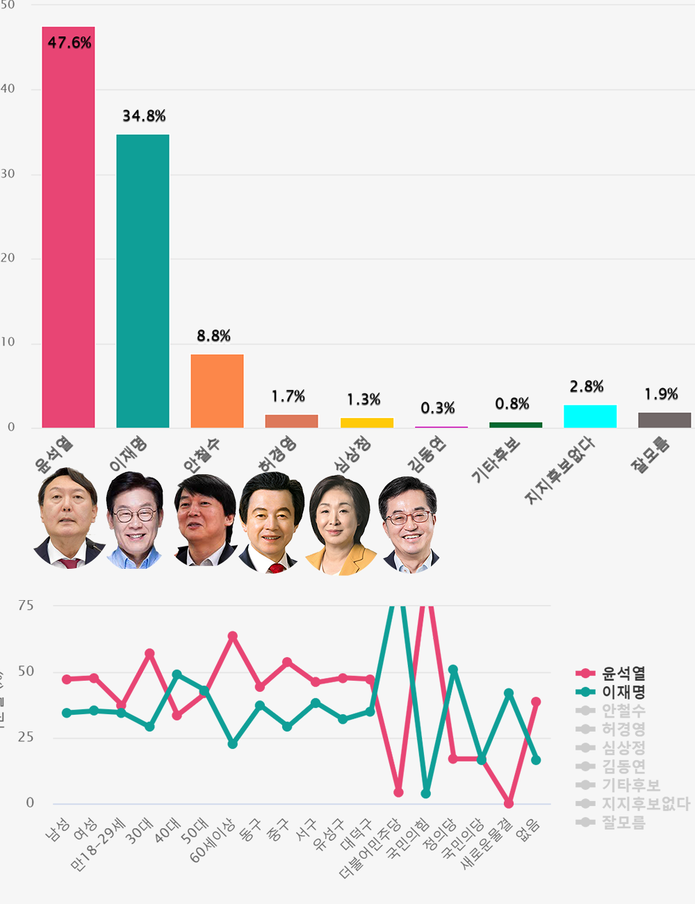 ¡ã ´ëÀü½Ã ´ë¼±Èĺ¸ ÁöÁöµµ¡¥À±¼®¿ 47.6%, ÀÌÀç¸í 34.8%, ¾Èö¼ö 8.8%, Çã°æ¿µ 1.7%, ½É»óÁ¤ 1.3%, ±èµ¿¿¬ 0.3% ¼øÀ¸·Î ³ªÅ¸³ª