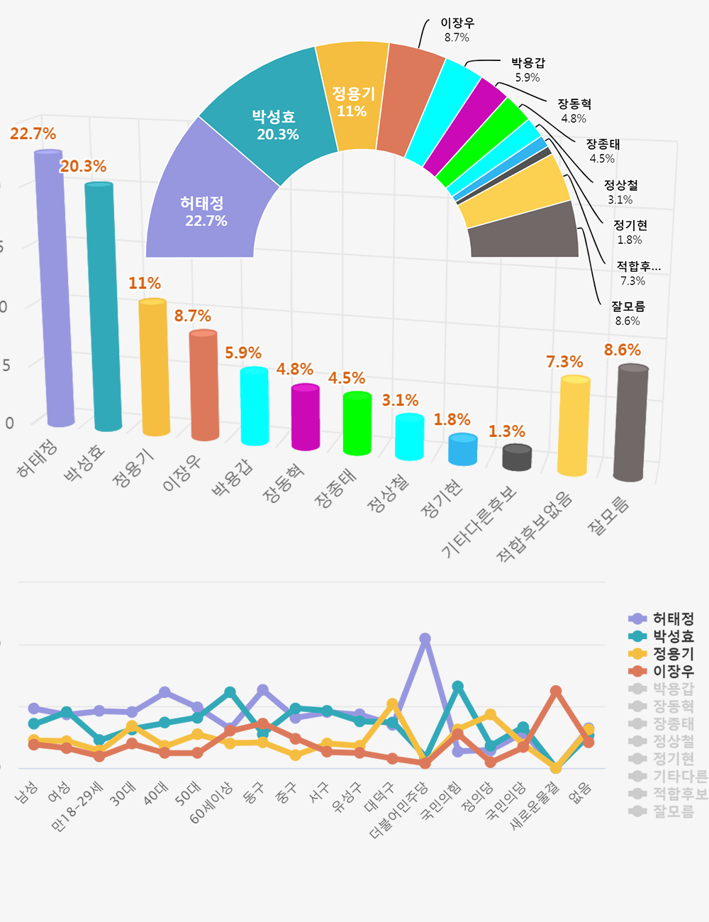 ¼ºº° ÁöÁöµµ ºÐ¼®¿¡¼ "ÇãÅÂÁ¤" È帴 ³²¼º(23.9%), ¿©¼º(21.5%)¼øÀ¸·Î, "¹Ú¼ºÈ¿" È帴 ¿©¼º(22.7%), ³²¼º(17.8%)¼øÀ¸·Î, "Á¤¿ë±â" È帴 ³²¼º(11.1%), ¿©¼º(10.9%)¼øÀ¸·Î, "ÀÌÀå¿ì" È帴 ³²¼º(9.5%), ¿©¼º(8%)¼øÀ¸·Î, "¹Ú¿ë°©" È帴 ¿©¼º(7.9%), ³²¼º(3.8%)¼øÀ¸·Î, "À嵿Çõ" È帴 ³²¼º(5.5%), ¿©¼º(4%)¼øÀ¸·Î, "ÀåÁ¾ÅÂ" È帴 ³²¼º(5.5%), ¿©¼º(3.5%)¼øÀ¸·Î, "Á¤»óö" È帴 ³²¼º(3.1%), ¿©¼º(3%)¼øÀ¸·Î, "Á¤±âÇö" È帴 ³²¼º(1.8%), ¿©¼º(1.7%)¼øÀ¸·Î °¼¼¸¦ º¸ÀÌ´Â °ÍÀ¸·Î ³ªÅ¸³µ´Ù.