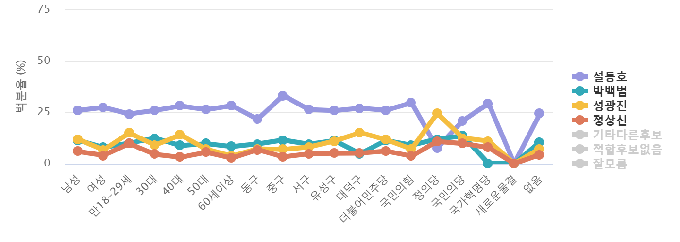 "µ¿±¸"Áö¿ªÀº¡¸À±¼®¿¡¹(44.4%),¡¸ÀÌÀç¸í¡¹(37.3%),¡¸¾Èö¼ö¡¹(9%)À̸ç, "Áß±¸"Áö¿ªÀº¡¸À±¼®¿¡¹(53.6%),¡¸ÀÌÀç¸í¡¹(29.3%),¡¸¾Èö¼ö¡¹(9.7%), "¼±¸"Áö¿ªÀº¡¸À±¼®¿¡¹(46%),¡¸ÀÌÀç¸í¡¹(38.4%),¡¸¾Èö¼ö¡¹(8.5%), "À¯¼º±¸"Áö¿ªÀº¡¸À±¼®¿¡¹(47.8%),¡¸ÀÌÀç¸í¡¹(32%),¡¸¾Èö¼ö¡¹(9.2%), "´ë´ö±¸"Áö¿ªÀº¡¸À±¼®¿¡¹(47.3%),¡¸ÀÌÀç¸í¡¹(35.1%),¡¸¾Èö¼ö¡¹(7.4%)¸¦ ±â·ÏÇß´Ù.