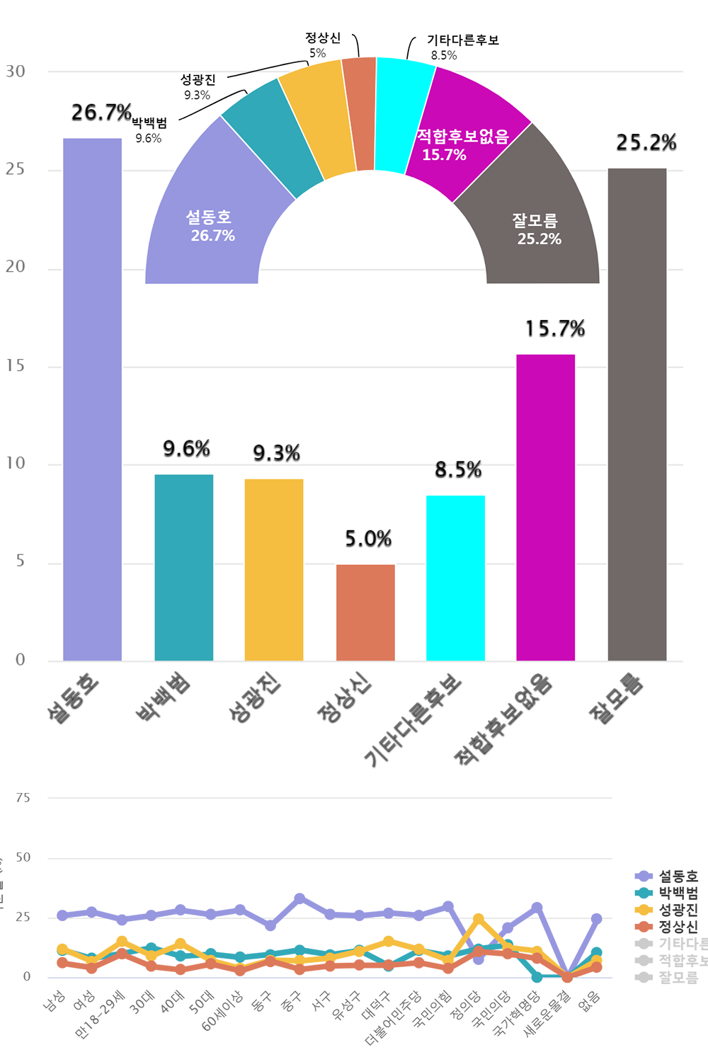 ´ëÀü ±³À°°¨ Èĺ¸ ÀûÇÕµµ¡¥¼³µ¿È£ 26.7%, ¹Ú¹é¹ü 9.6%, ¼º±¤Áø 9.3%