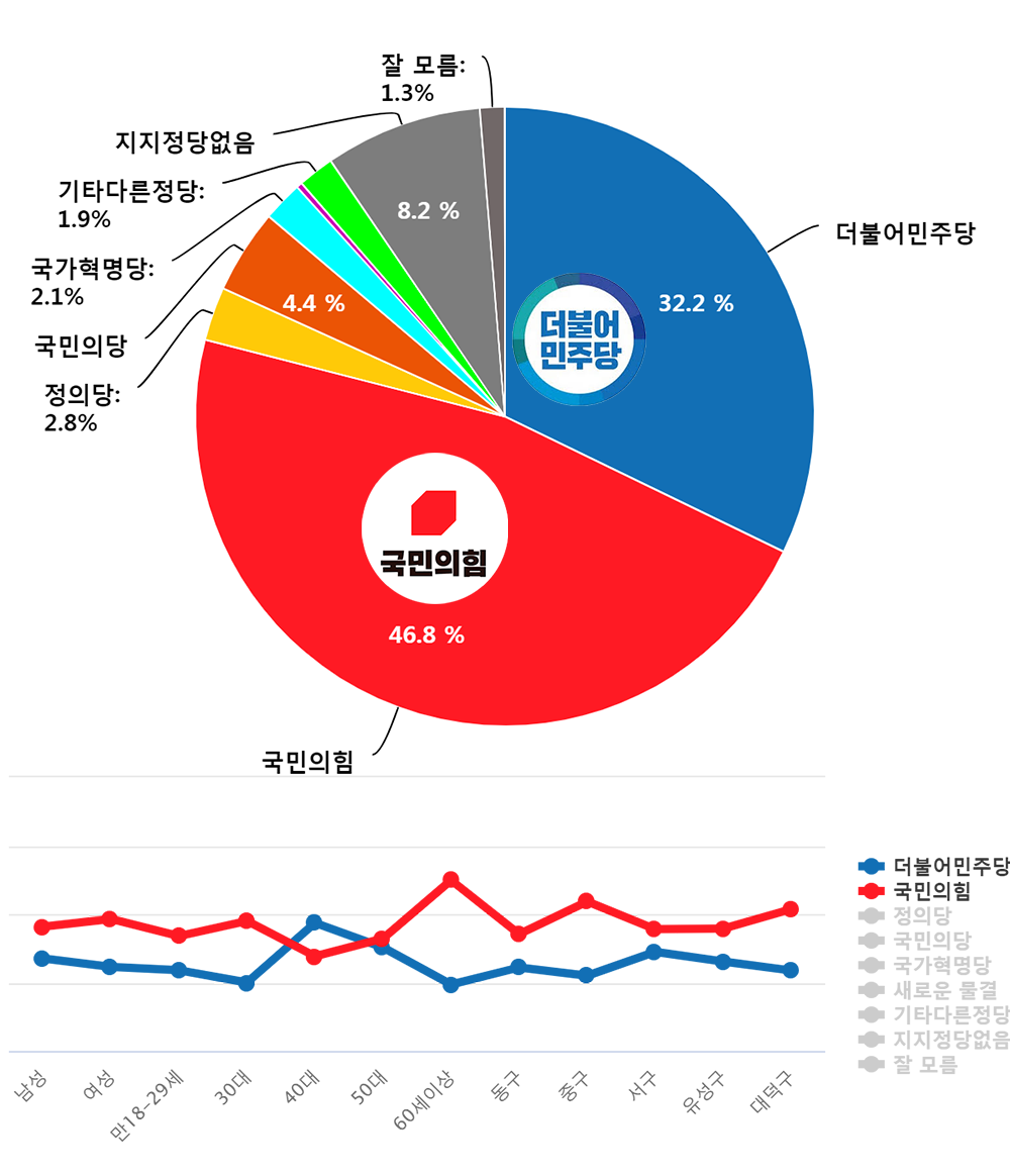 ¡ã ´ëÀü½Ã Á¤´çÁöÁöµµ¡¥±¹¹ÎÀÇÈû 46.8%, ´õºÒ¾î¹ÎÁÖ´ç 32.2%, ±¹¹ÎÀÇ´ç 4.4%, Á¤ÀÇ´ç 2.8%, ±¹°¡Çõ¸í´ç 2.1%, »õ·Î¿î ¹°°á 0.3% ¼øÀ¸·Î ³ªÅ¸³ª