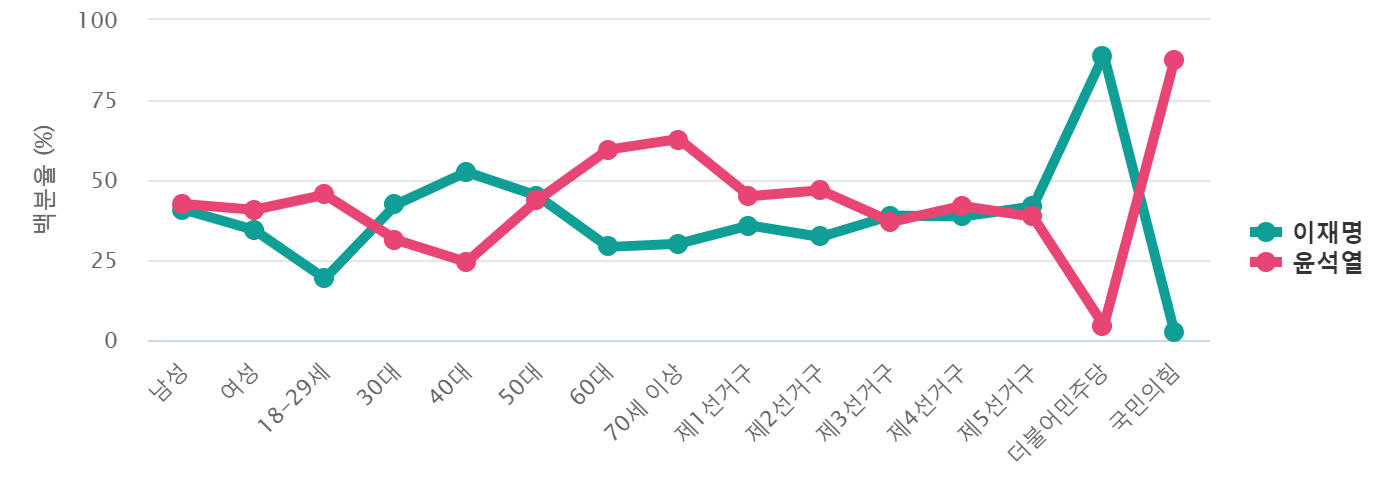 ¿¬·É´ëº° ÁöÁöµµ ºÐ¼®¿¡¼ "ÀÌÀç¸í" È帴 40´ë(52.5%) > 50´ë(45.1%) > 30´ë(42.3%) ¿¬·É´ë ¼øÀ¸·Î, "À±¼®¿" È帴 70¼¼ ÀÌ»ó(62.8%) > 60´ë(59.5%) > 18-29¼¼(45.4%) ¿¬·É´ë ¼øÀ¸·Î, "½É»óÁ¤" È帴 ¿¬·É´ë ¼øÀ¸·Î, "¾Èö¼ö" È帴 ¿¬·É´ë ¼øÀ¸·Î, "±èµ¿¿¬" È帴 ¿¬·É´ë ¼øÀ¸·Î °¼¼¸¦ º¸ÀÌ´Â °ÍÀ¸·Î ³ªÅ¸³µ´Ù.