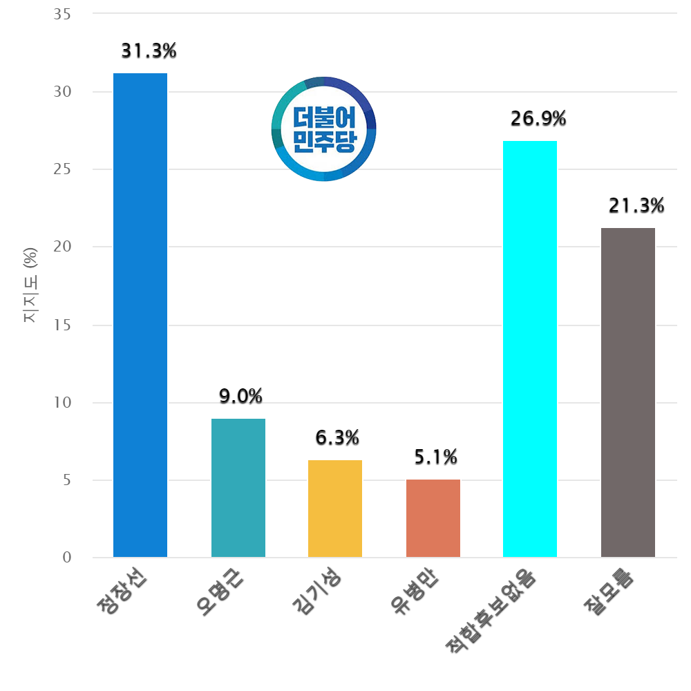 ¡ã ´õºÒ¾î¹ÎÁÖ´ç ÆòÅýÃÀå Èĺ¸ ÀûÇÕµµ¡¥Á¤Àå¼± 31.3%, ¿À¸í±Ù 9%, ±è±â¼º 6.3%, À¯º´¸¸ 5.1% ¼øÀ¸·Î ³ªÅ¸³ª