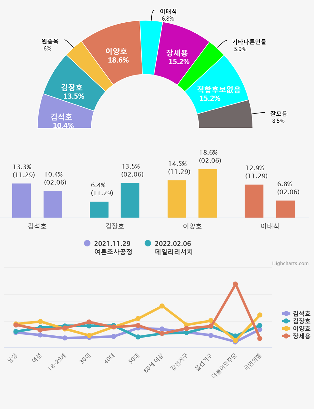À̾çÈ£ Àü Çѱ¹¸¶»çȸ ȸÀåÀº 60¼¼ ÀÌ»ó(31.3%), ±¹¹ÎÀÇÈû(24.5%), 50´ë(21.7%), À»¼±°Å±¸(20.2%), ¿©¼º(19.6%)¼øÀ¸·Î ³ôÀº ÁöÁö¸¦ ¹ÞÀ¸¸ç, ±è¼®È£ ±¹¹ÎÀÇÈû ¹ÎÁ·ÈÇØ ºÐ°úÀ§¿øÀåÀº 50´ë(14.6%), 60¼¼ ÀÌ»ó(13.8%), ±¹¹ÎÀÇÈû(13.7%), °©¼±°Å±¸(11.5%), ³²¼º(11.3%)¼øÀ¸·Î, ±èÀåÈ£ Àü °æ»óºÏµµ ±âȹÁ¶Á¤½ÇÀåÀº ±¹¹ÎÀÇÈû(16.7%), 40´ë(16.5%), 30´ë(16.4%), 18-29¼¼(16.4%), À»¼±°Å±¸(15.9%)¼øÀ¸·Î, Àå¼¼¿ë ±¸¹Ì½ÃÀåÀº ´õºÒ¾î¹ÎÁÖ´ç(47.8%), 30´ë(19.2%), ³²¼º(17.1%), 50´ë(16.7%), À»¼±°Å±¸(16.1%)¼øÀ¸·Î ÀÀ´äÀ» º¸¿´´Ù.