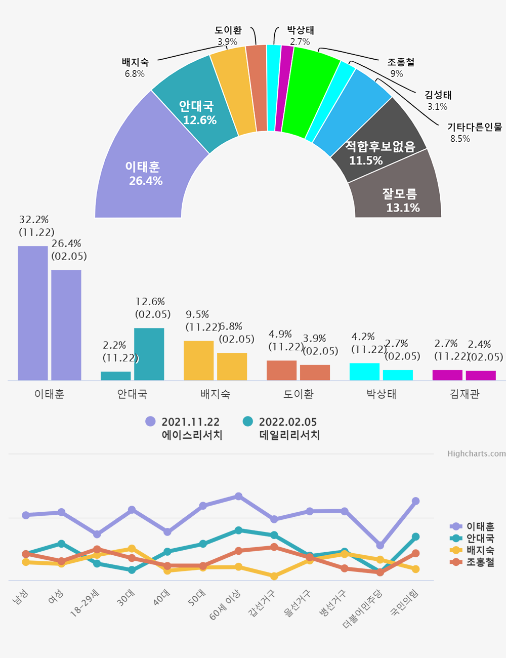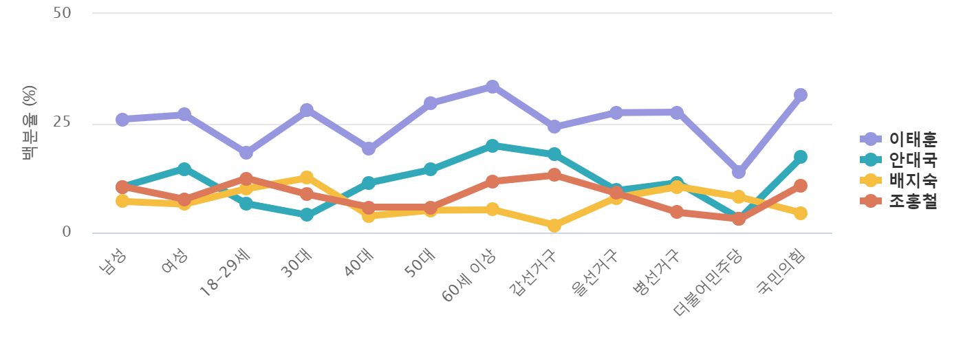ÀÌÅÂÈÆ Çö ´Þ¼±¸Ã»ÀåÀº 60¼¼ ÀÌ»ó(33.4%), ±¹¹ÎÀÇÈû(31.3%), 50´ë(29.6%), 30´ë(27.9%), º´¼±°Å±¸(27.5%)¼øÀ¸·Î ³ôÀº ÁöÁö¸¦ ¹ÞÀ¸¸ç, ¾È´ë±¹ Çö ´Þ¼±¸ ÀÇȸ ºÎÀÇÀåÀº 60¼¼ ÀÌ»ó(19.9%), °©¼±°Å±¸(17.8%), ±¹¹ÎÀÇÈû(17.2%), ¿©¼º(14.6%), 50´ë(14.4%)¼øÀ¸·Î, ¹èÁö¼÷ Àü ´ë±¸½Ã ÀÇȸ ÀÇÀåÀº 30´ë(12.5%), º´¼±°Å±¸(10.5%), 18-29¼¼(10%), ´õºÒ¾î¹ÎÁÖ´ç(8.1%), À»¼±°Å±¸(8%)¼øÀ¸·Î, Á¶È«Ã¶ Àü ´ë±¸½ÃÀÇ¿øÀº °©¼±°Å±¸(13.1%), 18-29¼¼(12.4%), 60¼¼ ÀÌ»ó(11.7%), ±¹¹ÎÀÇÈû(10.8%), ³²¼º(10.5%)¼øÀ¸·Î ÀÀ´äÀ» º¸¿´´Ù.