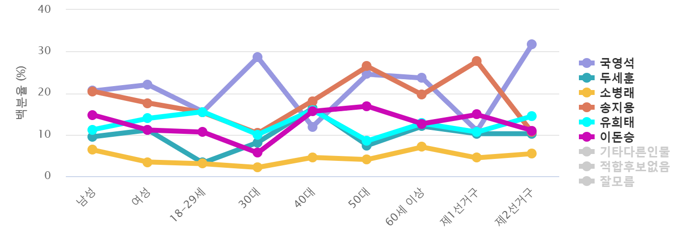 ±¹¿µ¼® È帴 "30´ë" ¿¬·É´ë¿¡¼ 2À§¿Í 10% ÀÌ»ó Å« Â÷ÀÌ·Î ³ôÀº ÁöÁö¸¦ ¹Þ¾ÒÀ¸¸ç "60¼¼ ÀÌ»ó" ¿¬·É´ë¿¡¼ ¼Òº´·¡ Èĺ¸¿Í 5% À̳» Á¢ÀüÀ» º¸ÀÌ¸ç ¼ÛÁö¿ë È帴 "50´ë","40´ë" ¿¬·É´ë¿¡¼ ¼Òº´·¡ Èĺ¸¿Í 5% À̳» Á¢ÀüÀ» º¸À̸ç À¯ÈñÅ È帴 "18-29¼¼" ¿¬·É´ë¿¡¼ ¼ÛÁö¿ë Èĺ¸¿Í 5% À̳» Á¢ÀüÀ» º¸À̸ç , ±¹¿µ¼® È帴 "Á¦2¼±°Å±¸" Áö¿ª¿¡¼ 2À§¿Í 10% ÀÌ»ó Å« Â÷ÀÌ·Î ³ôÀº ÁöÁö¸¦ ¹Þ¾ÒÀ¸¸ç ¼ÛÁö¿ë È帴 "Á¦1¼±°Å±¸" ¿¡¼ 2À§¿Í 10% ÀÌ»ó Å« Â÷ÀÌ·Î ³ôÀº ÁöÁö¸¦ ¹Þ¾ÒÀ¸¸ç , ±¹¿µ¼® È帴 "¿©¼º","³²¼º" ÀÀ´äÃþ¿¡¼ ¼Òº´·¡ Èĺ¸¿Í 5% À̳» Á¢Àü ¿ì¼¼¸¦ º¸¿´´Ù.