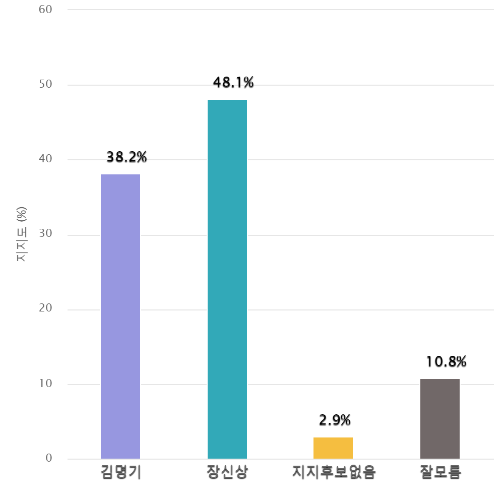 "³²¼º"´Â ¡¸Àå½Å»ó¡¹42.5% > ¡¸±è¸í±â¡¹42.2% (8.3%¡è), "¿©¼º"´Â ¡¸Àå½Å»ó¡¹45.0% (0.4%¡è) > ¡¸±è¸í±â¡¹36.1% (9.8%¡è)¼øÀ¸·Î ÁöÁö¸¦ ¹Þ¾Ò´Ù.