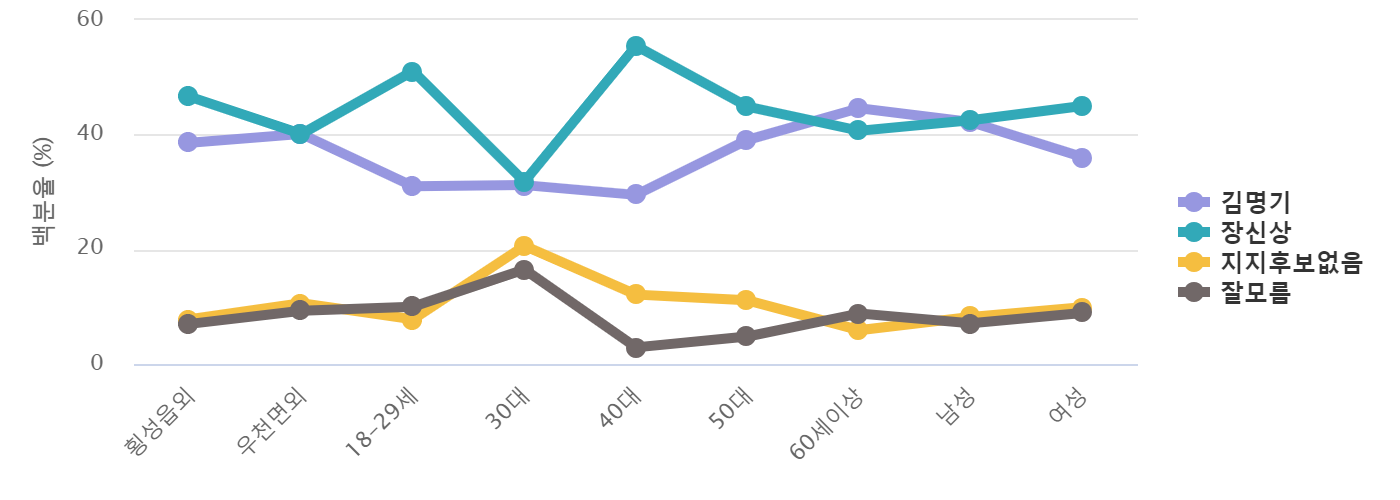 Àå½Å»ó È帴 "40´ë","18-29¼¼" ¿¬·É´ë¿¡¼­ 2À§ ±è¸í±â Èĺ¸º¸´Ù 10%p ÀÌ»ó Å« Â÷ÀÌ·Î ³ôÀº ÁöÁö¸¦ ¹Þ¾Ò°í, "Á¦1¼±°Å±¸" Áö¿ª°ú "50´ë" ¿¬·ÉÃþ¿¡¼­´Â ±è¸í±â Èĺ¸º¸´Ù °¢°¢ 8.0%p, 5.8%p ³ô¾ÒÀ¸¸ç, "30´ë" ¿¬·ÉÃþ°ú "³²¼º" ÀÀ´äÃþ¿¡¼­´Â ±è¸í±â Èĺ¸¿Í 3%À̳» Á¢ÀüÀ» ¹úÀÌ´Â °ÍÀ¸·Î ³ªÅ¸³µ´Ù.