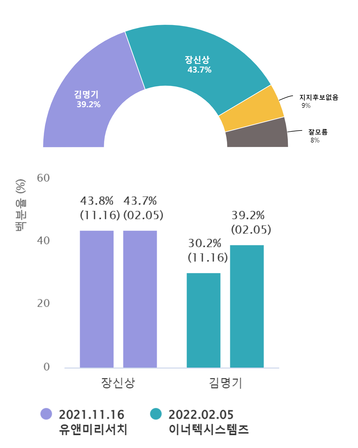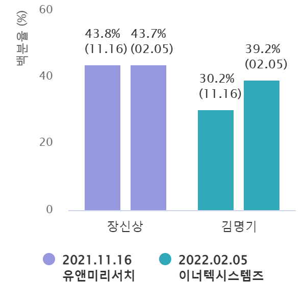 ¡ã Â÷±â Ⱦ¼º±º¼ö Èĺ¸ ÁöÁöµµ¡¥"Àå½Å»ó" 0.1%p Ç϶ô(43.8%¡æ43.7%), "±è¸í±â" 9.0%p »ó½Â(30.2%¡æ39.2%)