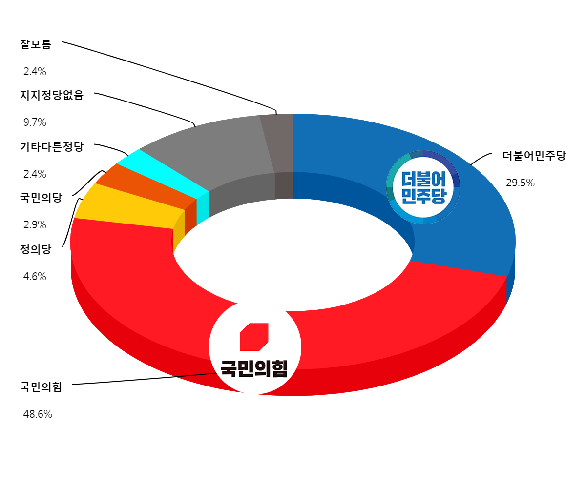 ¡ã Ⱦ¼º±º Á¤´çÁöÁöµµ¡¥±¹¹ÎÀÇÈû 48.6%, ´õºÒ¾î¹ÎÁÖ´ç 29.5%, Á¤ÀÇ´ç 4.6%, ±¹¹ÎÀÇ´ç 2.9%