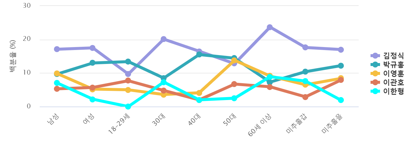 "18-29¼¼" ¿¬·É´ë´Â ¡¸¹Ú±ÔÈ«¡¹13.4% > ¡¸±èÁ¤½Ä¡¹9.7% > ¡¸À̰üÈ£¡¹7.7% , "30´ë"´Â ¡¸±èÁ¤½Ä¡¹20.1% > ¡¸¹Ú±ÔÈ«¡¹8.5% > ¡¸ÀÌÇÑÇü¡¹7.3% , "40´ë"´Â ¡¸±èÁ¤½Ä¡¹16.5% > ¡¸¹Ú±ÔÈ«¡¹15.5% > ¡¸ÀÌ¿µÈÆ¡¹4.1% , "50´ë"´Â ¡¸¹Ú±ÔÈ«¡¹14.4% > ¡¸ÀÌ¿µÈÆ¡¹13.8% > ¡¸±èÁ¤½Ä¡¹12.8% , "60¼¼ ÀÌ»ó"´Â ¡¸±èÁ¤½Ä¡¹23.7% > ¡¸ÀÌ¿µÈÆ¡¹9.1% > ¡¸ÀÌÇÑÇü¡¹8.9% ¼øÀ¸·Î °á°ú¸¦ º¸¿´´Ù.