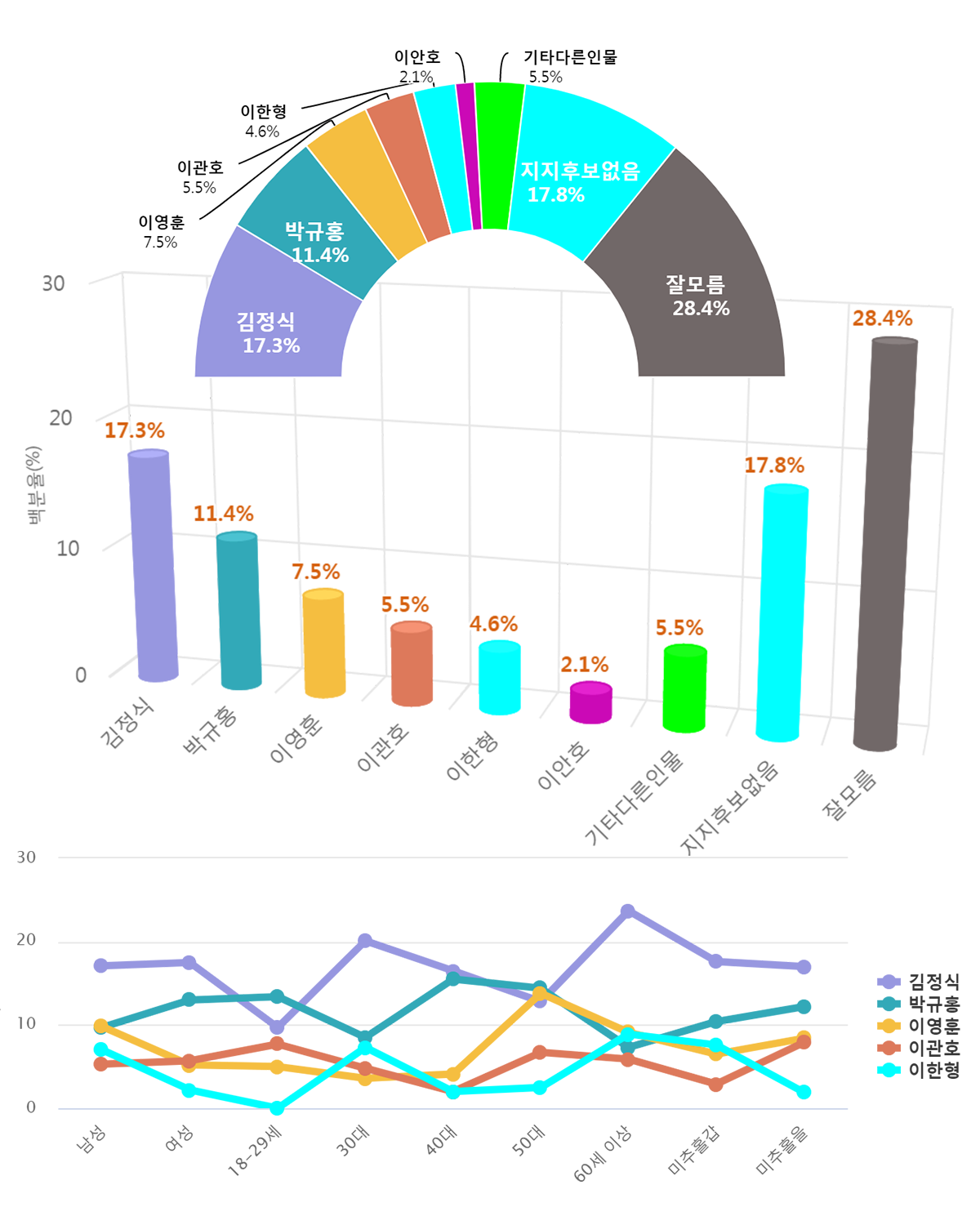 "³²¼º"´Â ¡¸±èÁ¤½Ä¡¹17.1% > ¡¸ÀÌ¿µÈÆ¡¹9.8% > ¡¸¹Ú±ÔÈ«¡¹9.7% , "¿©¼º"´Â ¡¸±èÁ¤½Ä¡¹17.5% > ¡¸¹Ú±ÔÈ«¡¹13.0% > ¡¸À̰üÈ£¡¹5.7% ¼øÀ¸·Î ÀÀ´äµÇ¾ú´Ù.