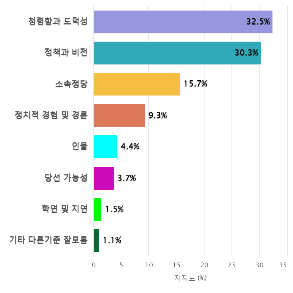 ¡ã ¹ÌÃßȦ±¸ Èĺ¸ ¼±Åà ±âÁØ¡¥Ã»·ÅÇÔ°ú µµ´ö¼º 32.5%, Á¤Ã¥°ú ºñÀü 30.3%, ¼Ò¼ÓÁ¤´ç 15.7%, Á¤Ä¡Àû °æÇè ¹× °æ·û 9.3%, Àι° 4.4%, ´ç¼± °¡´É¼º 3.7%, Çп¬ ¹× Áö¿¬ 1.5%,