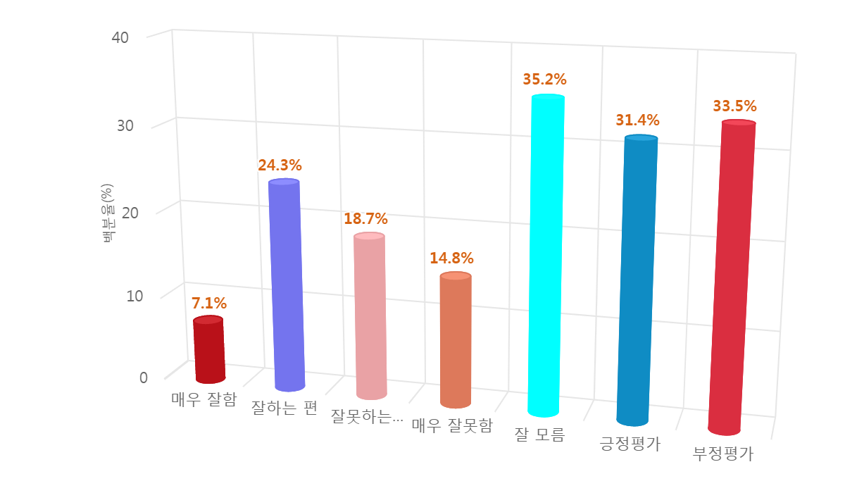 À̰ȣ ³²µ¿±¸Ã»Àå ±¸Á¤¿î¿µÆò°¡°¡ ÀßÇÏ´Â Æí(21.6%), À߸øÇÏ´Â Æí(19.9%), ¸Å¿ì À߸øÇÔ(19.0%), ¸Å¿ì ÀßÇÔ(9.5%)À¸·Î ³ª¿Ô´Ù. "ÀßÇÏ´Â Æí"°ú "¸Å¿ì ÀßÇÔ"À» ÇÕÇÑ ¡¸±àÁ¤Æò°¡¡¹ °¡ "À߸øÇÏ´Â Æí"°ú "¸Å¿ì À߸øÇÔ"À» ÇÕÇÑ ºÎÁ¤Æò°¡ º¸´Ù ³·°Ô ÀÀ´äµÇ¾ú´Ù.