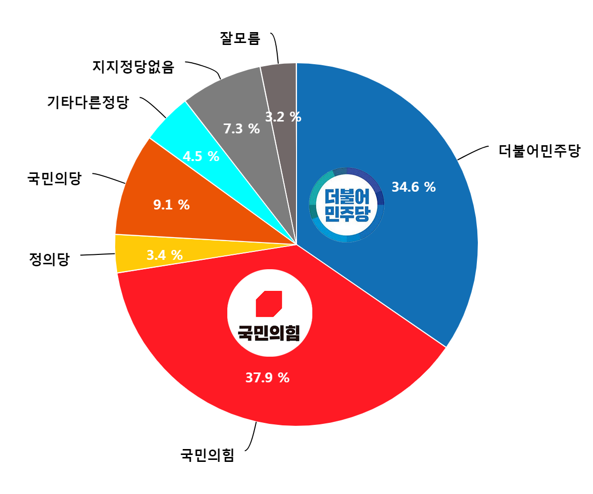 ¡¸¹ÌÃßȦ±¸ Á¤´çÁöÁöµµ¡¹¸¦ Á¶»çÇÑ °á°ú ¸¦ Á¶»çÇÑ °á°ú ¡¸±¹¹ÎÀÇÈû¡¹ÀÌ 37.9%, ¡¸´õºÒ¾î¹ÎÁִ硹ÀÌ 34.6%·Î ¾ç´çÀÇ ÁöÁöµµ´Â 3.3%p Â÷ÀÌ·Î ÃÊ Á¢ÀüÀ» ¹úÀÌ´Â °ÍÀ¸·Î ³ªÅ¸³µ´Ù.