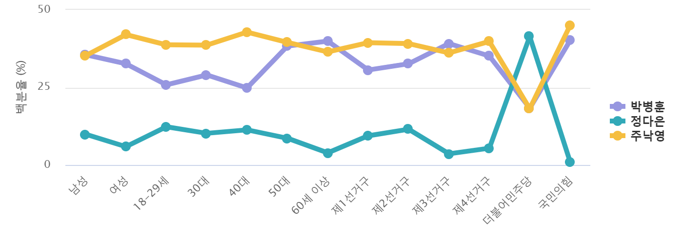 ¹Úº´ÈÆ È帴 "60¼¼ ÀÌ»ó" ¿¬·É´ë¿¡¼ ÁÖ³«¿µ Èĺ¸º¸´Ù 3.5%p ³ô¾ÒÀ¸¸ç,ÁÖ³«¿µ È帴 "40´ë","18-29¼¼" ¿¬·É´ë¿¡¼ 2À§ ¹Úº´ÈÆ Èĺ¸º¸´Ù 10%p ÀÌ»ó Å« Â÷ÀÌ·Î ³ôÀº ÁöÁö¸¦ ¹Þ¾ÒÀ¸¸ç "50´ë" ¿¬·É´ë¿¡¼ ¹Úº´ÈÆ Èĺ¸¿Í 3% À̳» Á¢ÀüÀ» º¸À̸ç "30´ë" ¿¬·É´ë¿¡¼ ¹Úº´ÈÆ Èĺ¸º¸´Ù 9.6%p ³ô¾ÒÀ¸¸ç,, ¹Úº´ÈÆ È帴 "Á¦3¼±°Å±¸" Áö¿ª¿¡¼ ÁÖ³«¿µ Èĺ¸¿Í 3% À̳» Á¢ÀüÀ» º¸À̸ç ÁÖ³«¿µ È帴 "Á¦4¼±°Å±¸","Á¦1¼±°Å±¸","Á¦2¼±°Å±¸" Áö¿ª¿¡¼ ¹Úº´ÈÆ Èĺ¸º¸´Ù 6.5%p ³ô¾ÒÀ¸¸ç, ¹Úº´ÈÆ È帴 "³²¼º" ÀÀ´äÃþ¿¡¼ ÁÖ³«¿µ Èĺ¸¿Í 3% À̳» Á¢ÀüÀ» º¸À̸ç ÁÖ³«¿µ È帴 "¿©¼º" ÀÀ´äÃþ¿¡¼ ¹Úº´ÈÆ Èĺ¸º¸´Ù 9.4%p ³ô¾ÒÀ¸¸ç, Á¤´ÙÀº È帴 "´õºÒ¾î¹ÎÁÖ´ç" ÁöÁöÃþ¿¡¼ 2À§ ¹Úº´ÈÆ Èĺ¸º¸´Ù 10%p ÀÌ»ó Å« Â÷ÀÌ·Î ³ôÀº ÁöÁö¸¦ ¹Þ¾ÒÀ¸¸ç ÁÖ³«¿µ È帴 "±¹¹ÎÀÇÈû" ÁöÁöÃþ¿¡¼ ¹Úº´ÈÆ Èĺ¸º¸´Ù 4.8%p ³ô¾Ò´Ù.