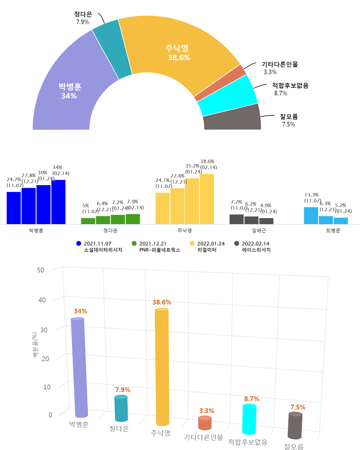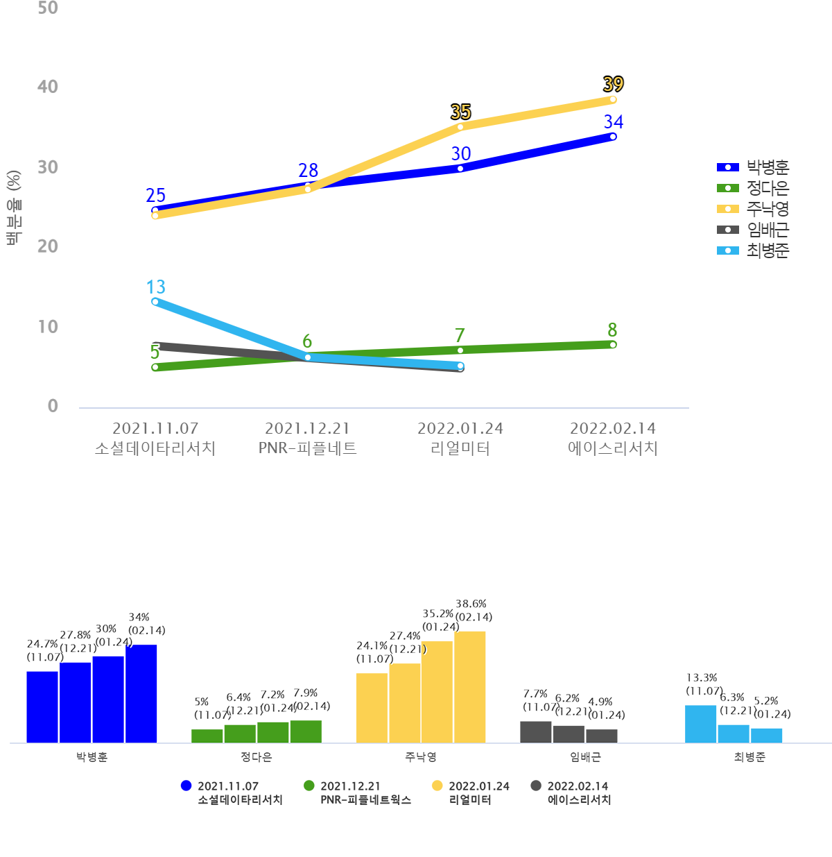 Áö³ 1¿ù 23ÀÏ ¸®¾ó¹ÌÅÍ¿¡¼ ½Ç½ÃµÈ Á¶»ç¿Í ºñ±³ÇØ º¼¶§, "¹Úº´ÈÆ" 4.0%p »ó½Â(30.0%¡æ34.0%), "ÁÖ³«¿µ" 3.4%p »ó½Â(35.2%¡æ38.6%), "Á¤´ÙÀº" 0.7%p »ó½Â(7.2%¡æ7.9%)·Î ÁöÁöÀ²ÀÇ º¯È°¡ ³ªÅ¸³µ´Ù.