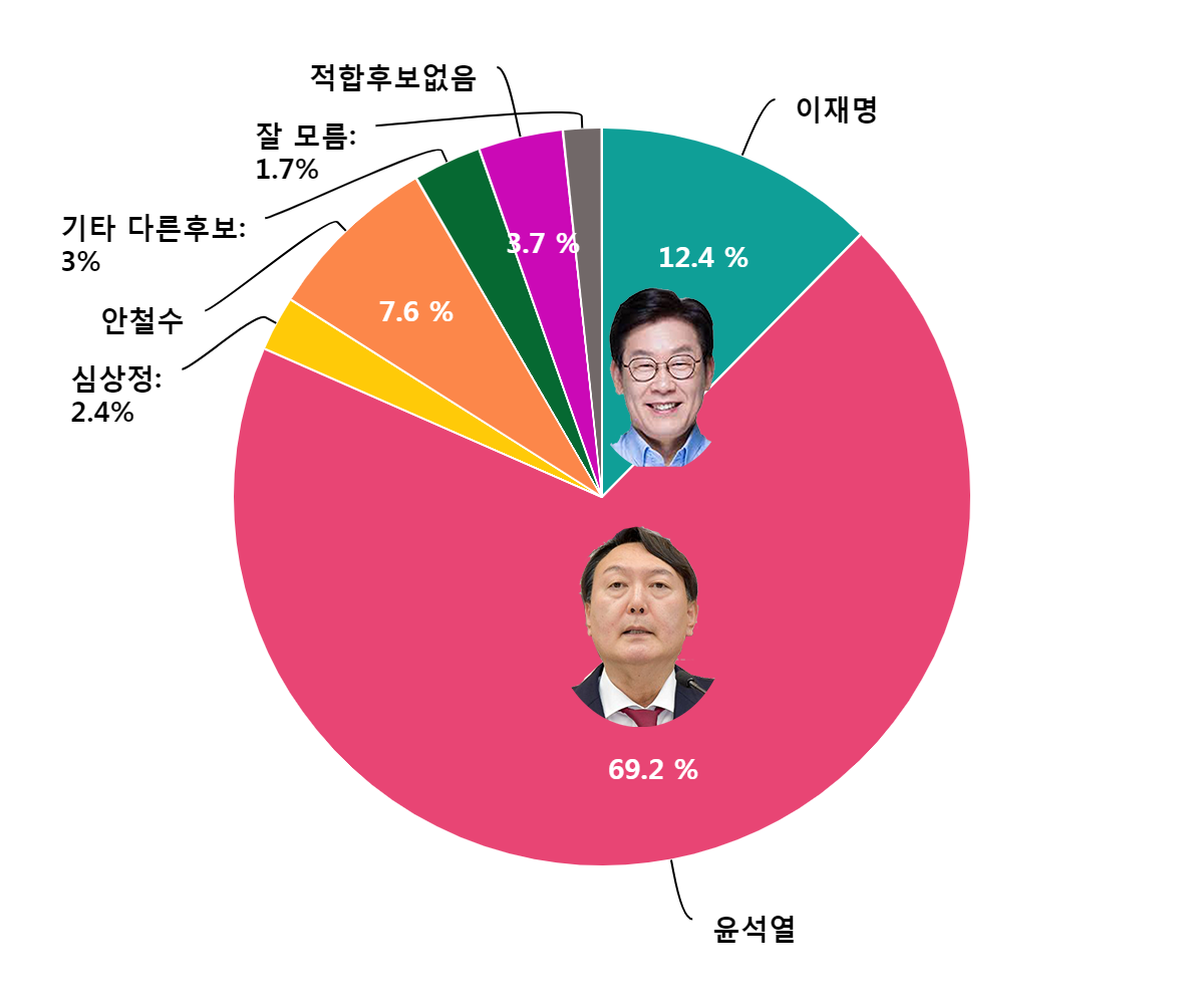 ¡¸°æÁֽà ´ë¼±Èĺ¸ ÀûÇÕµµ¡¹´Â ±¹¹ÎÀÇÈû À±¼®¿ È帰¡ 69.2%¸¦ ¾ò¾î 12.4%¸¦ ¾òÀº ´õºÒ¾î¹ÎÁÖ´ç ÀÌÀç¸í È常¦ 56.8%pÀÇ Å« Â÷ÀÌ·Î ¾Õ¼ ³ª°¡´Â °ÍÀ¸·Î ³ª¿Ô´Ù. ¡¸ÀûÇÕÈĺ¸¾øÀ½¡¹3.7%,¡¸±âŸ ´Ù¸¥Èĺ¸¡¹3.0%,¡¸Àß ¸ð¸§¡¹1.7%,ÀÇ ÀÀ´äµµ ±â·ÏµÇ¾ú´Ù.