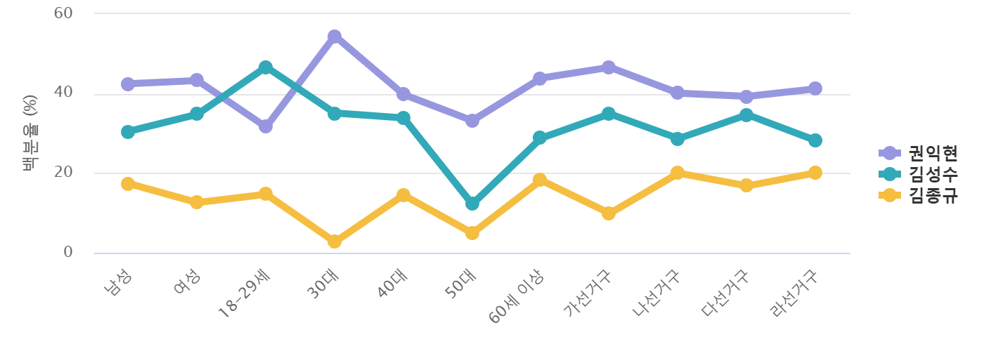"°¡¼±°Å±¸"Áö¿ªÀº ¡¸±ÇÀÍÇö¡¹46.6% (4.6%¡è) > ¡¸±è¼º¼ö¡¹34.9% (1.8%¡é) > ¡¸±èÁ¾±Ô¡¹9.9% (1.7%¡é), "³ª¼±°Å±¸"Áö¿ªÀº ¡¸±ÇÀÍÇö¡¹40.1% (4.9%¡é) > ¡¸±è¼º¼ö¡¹28.7% (5.6%¡è) > ¡¸±èÁ¾±Ô¡¹20.0% (1.4%¡è), "´Ù¼±°Å±¸"Áö¿ªÀº ¡¸±ÇÀÍÇö¡¹39.3% (7.9%¡è) > ¡¸±è¼º¼ö¡¹34.7% (5.4%¡é) > ¡¸±èÁ¾±Ô¡¹16.8% (4.6%¡è), "¶ó¼±°Å±¸"Áö¿ªÀº ¡¸±ÇÀÍÇö¡¹41.2% (5.3%¡è) > ¡¸±è¼º¼ö¡¹28.2% (1.7%¡è) > ¡¸±èÁ¾±Ô¡¹20.1% (0.6%¡è)¼øÀ¸·Î ³ªÅ¸³µ´Ù.