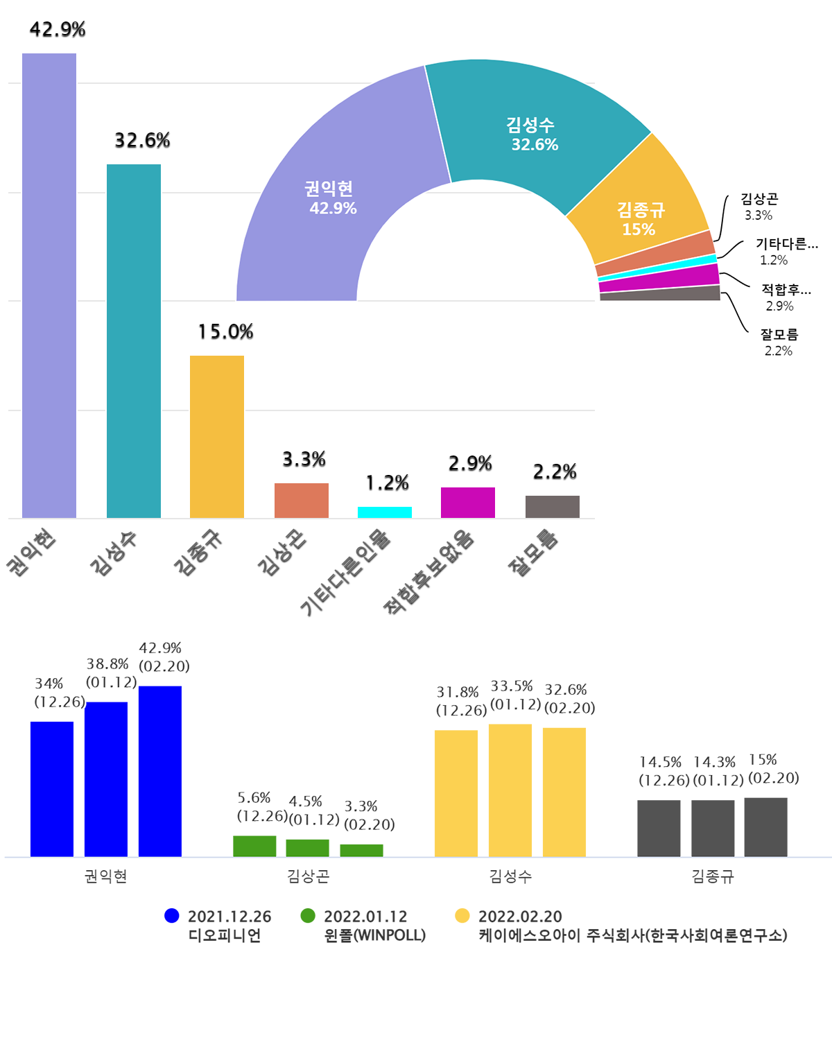 "³²¼º"´Â ¡¸±ÇÀÍÇö¡¹42.5% (4.9%¡è) > ¡¸±è¼º¼ö¡¹30.5% (1.7%¡é) > ¡¸±èÁ¾±Ô¡¹17.4% (2.4%¡è), "¿©¼º"´Â ¡¸±ÇÀÍÇö¡¹43.3% (3.3%¡è) > ¡¸±è¼º¼ö¡¹34.8% > ¡¸±èÁ¾±Ô¡¹12.6% (1.0%¡é)¼øÀ¸·Î ÀÀ´äµÇ¾ú´Ù.