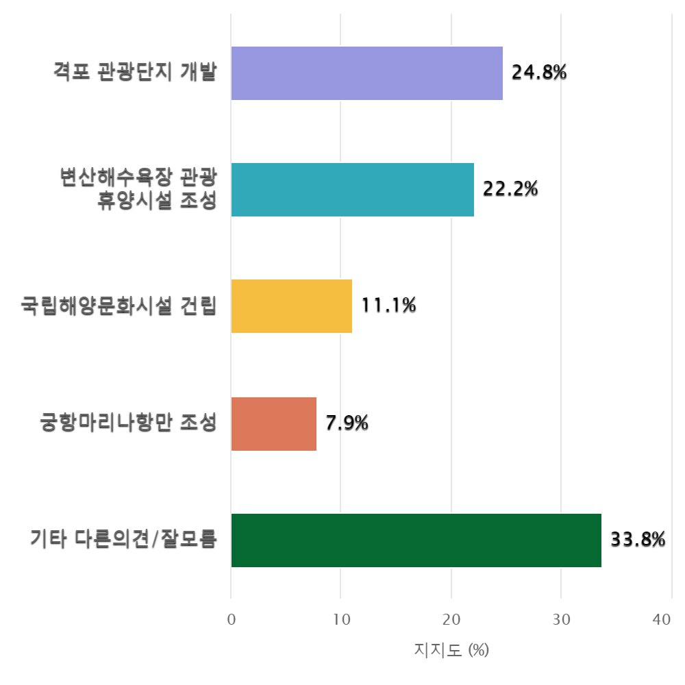 ¡¸ºÎ¾È±º ÁßÁ¡ Çö¾È»ç¾÷¡¹À¸·Î ¡¸°ÝÆ÷ °ü±¤´ÜÁö °³¹ß¡¹ (24.8%) , ¡¸º¯»êÇØ¼ö¿åÀå °ü±¤ ÈÞ¾ç½Ã¼³ Á¶¼º¡¹ (22.2%) , ¡¸±¹¸³Çؾ繮Ƚü³ °Ç¸³¡¹ (11.1%) , ¡¸±ÃÇ׸¶¸®³ªÇ׸¸ Á¶¼º¡¹ (7.9%) ¼øÀ¸·Î ÀÀ´äµÇ¾ú´Ù.