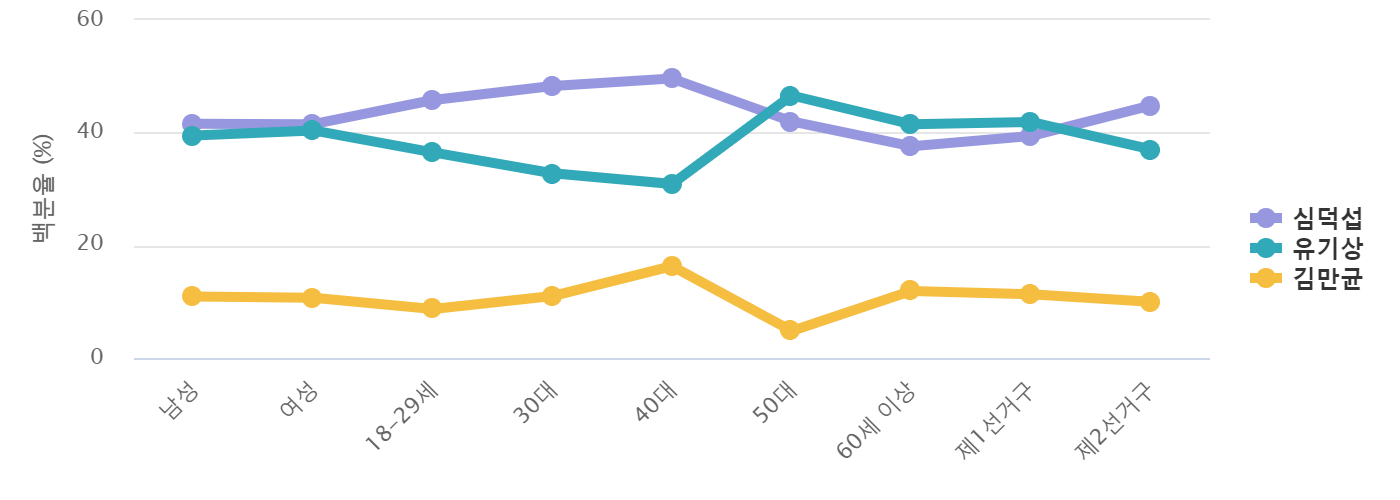 ½É´ö¼· È帴 "40´ë","30´ë" ¿¬·ÉÃþ¿¡¼ 2À§ À¯±â»ó Èĺ¸º¸´Ù 10%p ÀÌ»ó Å« Â÷ÀÌ·Î ³ôÀº ÁöÁö¸¦ ¹Þ¾ÒÀ¸¸ç "18-29¼¼" ¿¬·ÉÃþ¿¡¼ À¯±â»ó Èĺ¸ º¸´Ù 9.3%p ³ô¾ÒÀ¸¸ç, À¯±â»ó È帴 "50´ë","60¼¼ ÀÌ»ó" ¿¬·ÉÃþ¿¡¼ ½É´ö¼· Èĺ¸, ½É´ö¼· Èĺ¸ º¸´Ù 4.6%p, 3.9%p °¢°¢ ³ô¾ÒÀ¸¸ç, ½É´ö¼· È帴 "Á¦2¼±°Å±¸" Áö¿ª¿¡¼ À¯±â»ó Èĺ¸ º¸´Ù 7.7%p ³ô¾ÒÀ¸¸ç, À¯±â»ó È帴 "Á¦1¼±°Å±¸" Áö¿ª¿¡¼ ½É´ö¼· Èĺ¸¿Í 3% À̳» Á¢ÀüÀ» º¸À̸ç , ½É´ö¼· È帴 "³²¼º","¿©¼º" ÀÀ´äÃþ¿¡¼ À¯±â»ó Èĺ¸¿Í 3% À̳» Á¢ÀüÀ» º¸¿´´Ù.
