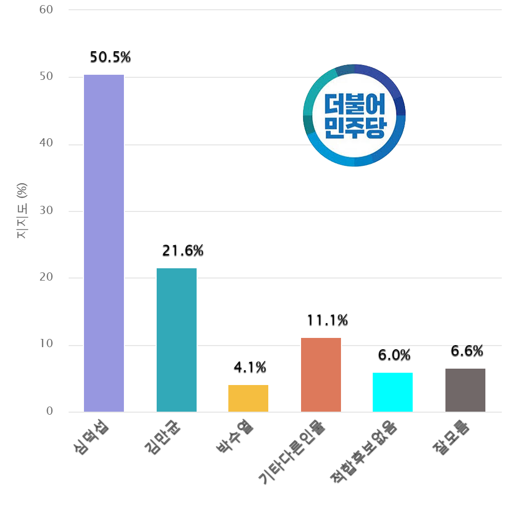 ¡¸´õºÒ¾î¹ÎÁÖ´ç °íⱺ¼ö Èĺ¸ÀûÇÕµµ¡¹´Â ½É´ö¼· Çö ¹ÎÁÖ´ç ÀüºÏµµ´ç ³ëÀ»´ë±³ °Ç¸³Æ¯º°À§¿øÀåÀÌ 50.5%¸¦ ¾ò¾î 21.6%¸¦ ¾òÀº ±è¸¸±Õ Çö ¹ÎÁÖ´ç ÀüºÏµµ´ç ȯ°æº¸ÀüƯº°À§¿øÀåÀ» ¿ÀÂ÷¹üÀ§¸¦ Å©°Ô ¹þ¾î³ 28.9%p Â÷ÀÌ·Î ¾Õ¼ ³ª°¡´Â °ÍÀ¸·Î ³ª¿Ô´Ù. ¡¸±âŸ´Ù¸¥Àι°¡¹11.1%,¡¸À߸𸧡¹6.6%,¡¸ÀûÇÕÈĺ¸¾øÀ½¡¹6.0%,ÀÇ ÀÀ´äµµ ±â·ÏµÇ¾ú´Ù.