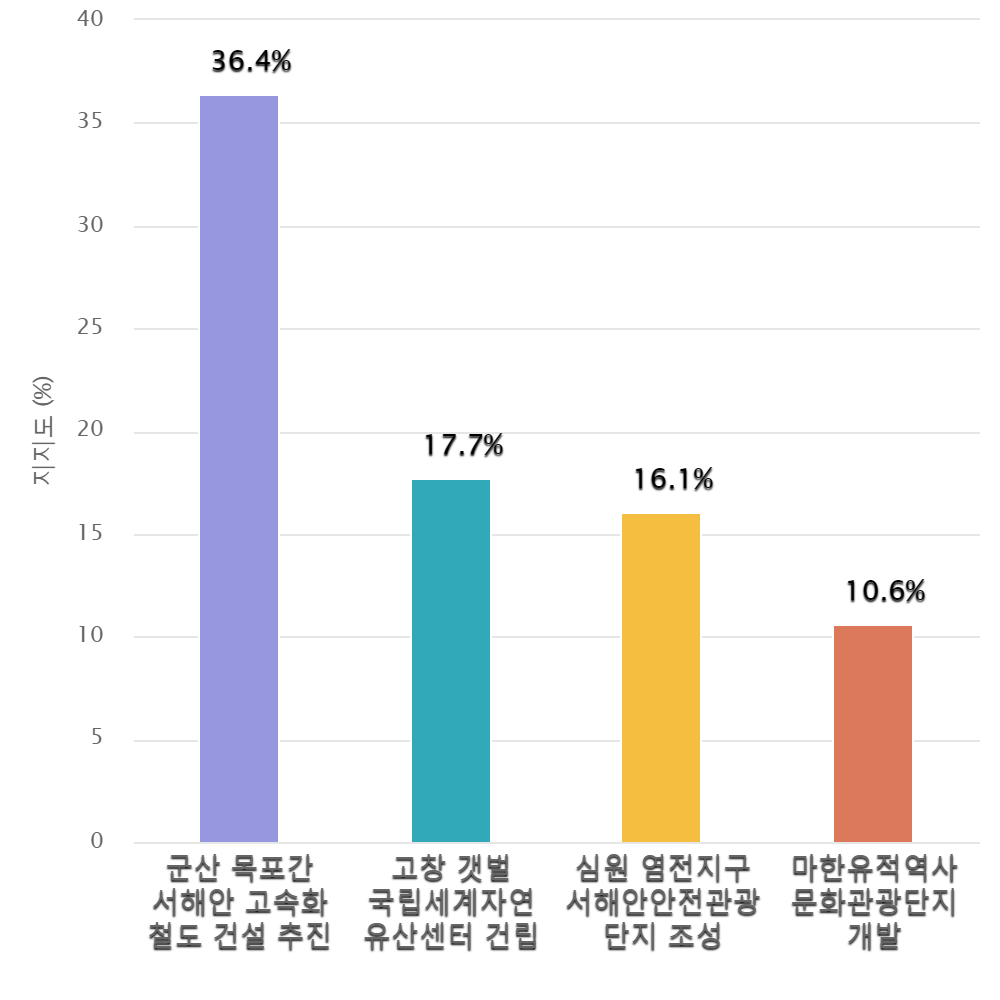¡¸°íⱺ ÁßÁ¡ Çö¾È»ç¾÷¡¹À¸·Î ¡¸±º»ê ¸ñÆ÷°£ ¼ÇØ¾È °í¼ÓÈ Ã¶µµ °Ç¼³ ÃßÁø¡¹ (36.4%) , ¡¸°íâ °¹¹ú ±¹¸³¼¼°èÀÚ¿¬ À¯»ê¼¾ÅÍ °Ç¸³¡¹ (17.7%) , ¡¸½É¿ø ¿°ÀüÁö±¸ ¼ÇؾȾÈÀü°ü±¤ ´ÜÁö Á¶¼º¡¹ (16.1%) , ¡¸¸¶ÇÑÀ¯Àû¿ª»ç ¹®È°ü±¤´ÜÁö °³¹ß¡¹ (10.6%)¼øÀ¸·Î ÀÀ´äµÇ¾ú´Ù.
